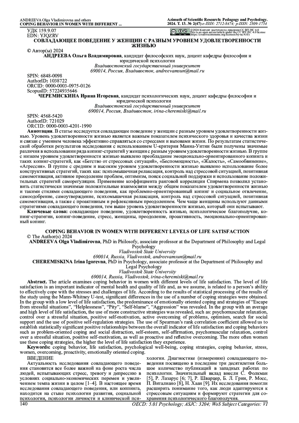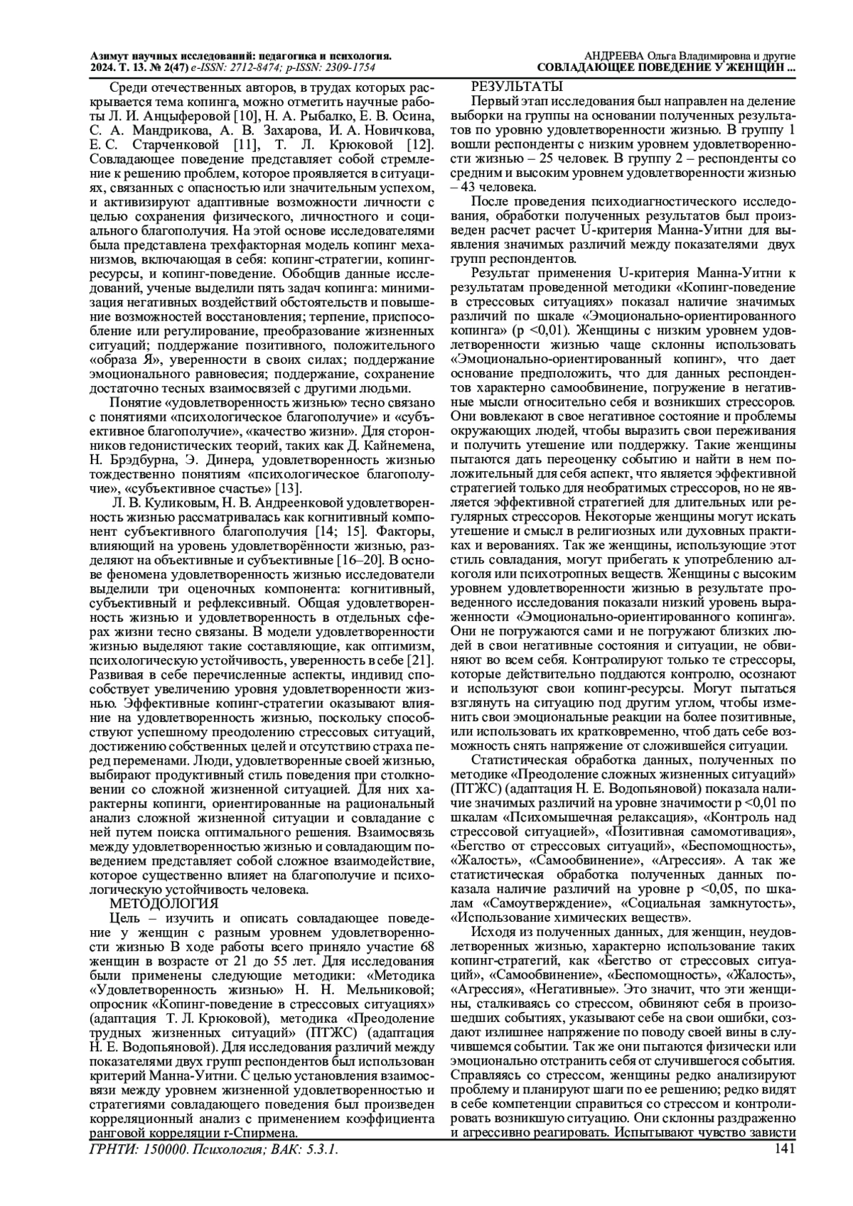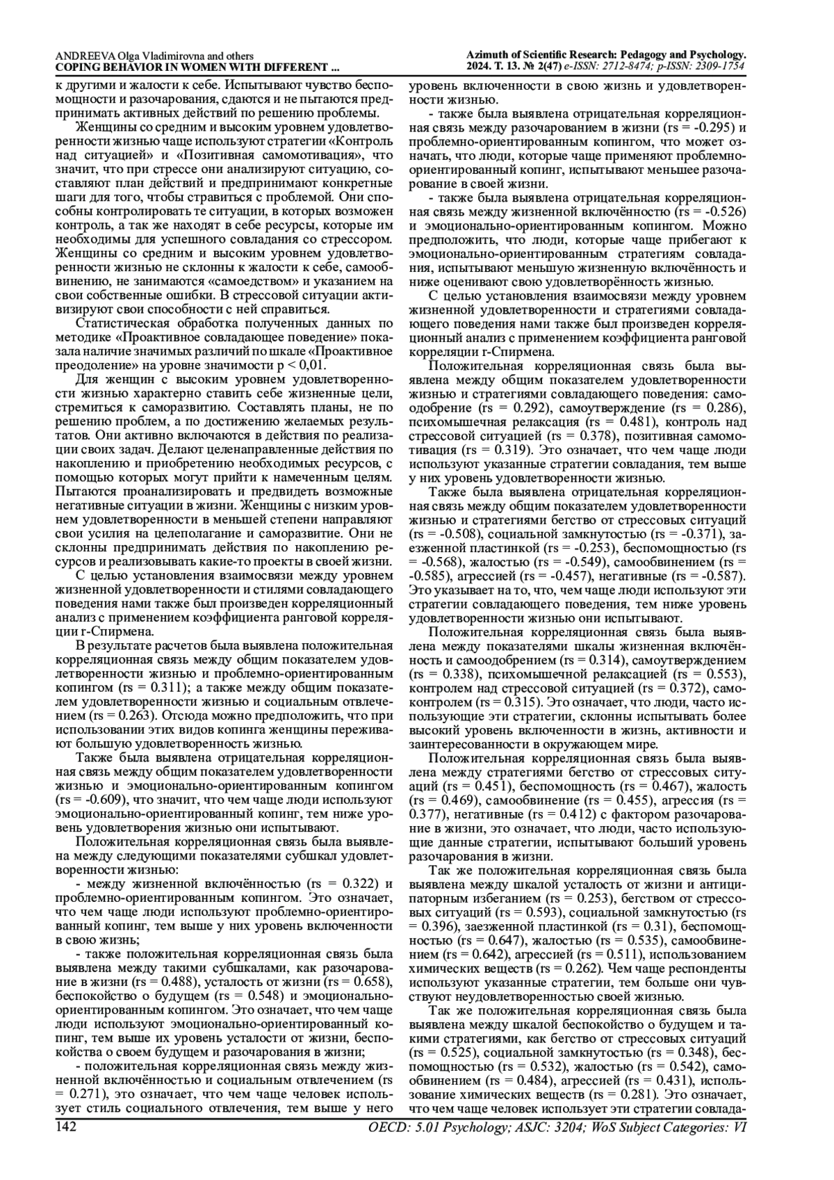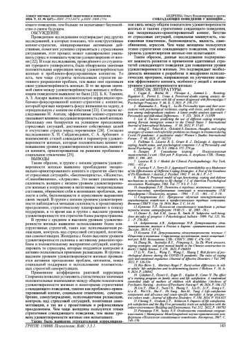 В статье исследуется совладающее поведение у женщин с разным уровнем удовлетворенности жизнью. Уровень удовлетворенности жизнью является важным показателем психического здоровья и качества жизни и связан с умением человека эффективно справляться со стрессами и вызовами жизни. По результатам статистической обработки результатов исследования с использованием U-критерия Манна-Уитни были получены значимые различия в использовании ряда копинг-стратегий у женщин с разным уровнем удовлетворенности жизнью. В группе с низким уровнем удовлетворенности жизнью выявлено преобладание эмоционально-ориентированного копинга и таких копинг-стратегий, как «Бегство от стрессовых ситуаций», «Беспомощность», «Жалость», «Самообвинение», «Агрессия». В группе со средним и высоким уровнем удовлетворенности жизнью выявлено использование более конструктивных стратегий, таких как: психомышечная релаксация, контроль над стрессовой ситуацией, позитивная самомотивация, активное преодоление проблем, оптимизм, поиск социальной поддержки и использование положительных стратегий саморегуляции. Применение коэффициента ранговой корреляции Спирмена позволил установить статистически значимые положительные взаимосвязи между общим показателем удовлетворенности жизнью и такими стилями совладающего поведения, как проблемно-ориентированный копинг и социальное отвлечение, самоодобрение, самоутверждение, психомышечная релаксация, контроль над стрессовой ситуацией, позитивная самомотивация, а также с проактивным и рефлексивным преодолением. Чем чаще женщины используют данными стратегиями совладающего поведения, тем выше уровень удовлетворенности жизнью, который они испытывают.