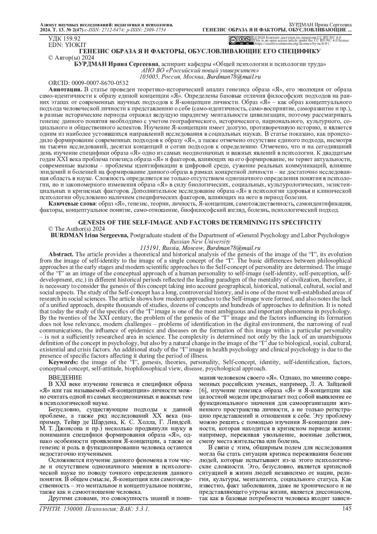 В статье проведен теоретико-исторический анализ генезиса образа «Я», его эволюция от образа само-идентичности к образу единой концепции «Я». Определены базовые отличия философских подходов на ранних этапах от современных научных подходов к Я-концепции личности. Образ «Я» - как образ концептуального подхода человеческой личности к представлению о себе (само-идентичность, само-восприятие, саморазвитие и пр.) в разные исторические периоды отражало ведущую парадигму ментальности цивилизации, поэтому рассматривать генезис данного понятия необходимо с учетом географического, исторического, национального, культурного, социального и общественного аспектов. Изучение Я-концепции имеет долгую, противоречивую историю, и является одним из наиболее устоявшихся направлений исследования в социальных науках. В статье показано, как происходило формирование современных подходов к образу «Я», а также отмечено отсутствие единого подхода, несмотря на тысячи исследований, десятки концепций и сотни подходов к определению. Отмечено, что и на сегодняшний день изучение специфики образа «Я» одно из самых неоднозначных и важных явлений в психологии. К двадцатым годам XXI века проблема генезиса образа «Я» и факторов, влияющих на его формирование не теряет актуальности, современные вызовы - проблемы идентификации в цифровой среде, сужение реальных коммуникаций, влияние эпидемий и болезней на формирование данного образа в рамках конкретной личности - не достаточно исследованная область в науке. Сложность определяется не только отсутствием однозначного определения понятия в психологии, но и закономерного изменения образа «Я» в силу биологических, социальных, культурологических, экзистенциальных и кризисных факторов. Дополнительное исследование образа «Я» в психологии здоровья и клинической психологии обусловлено наличием специфических факторов, влияющих на него в период болезни.