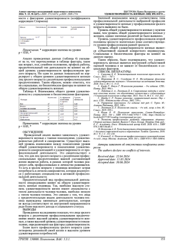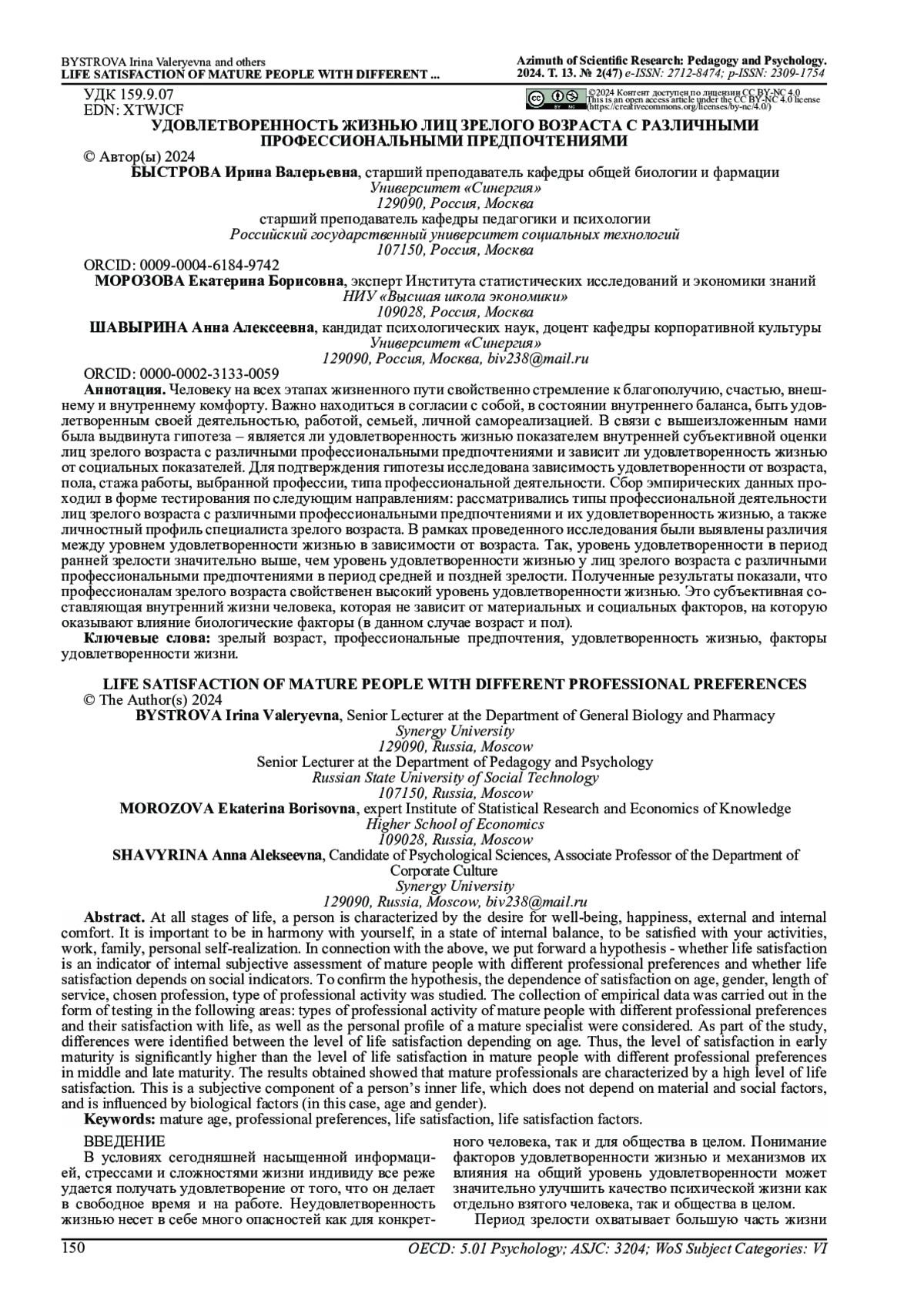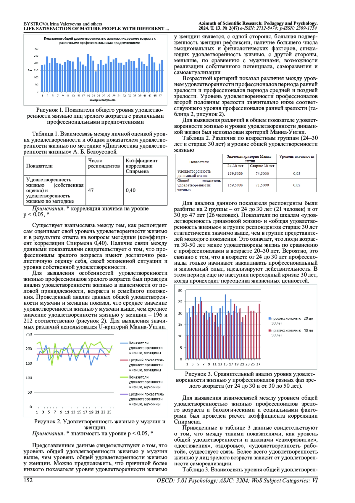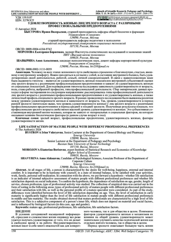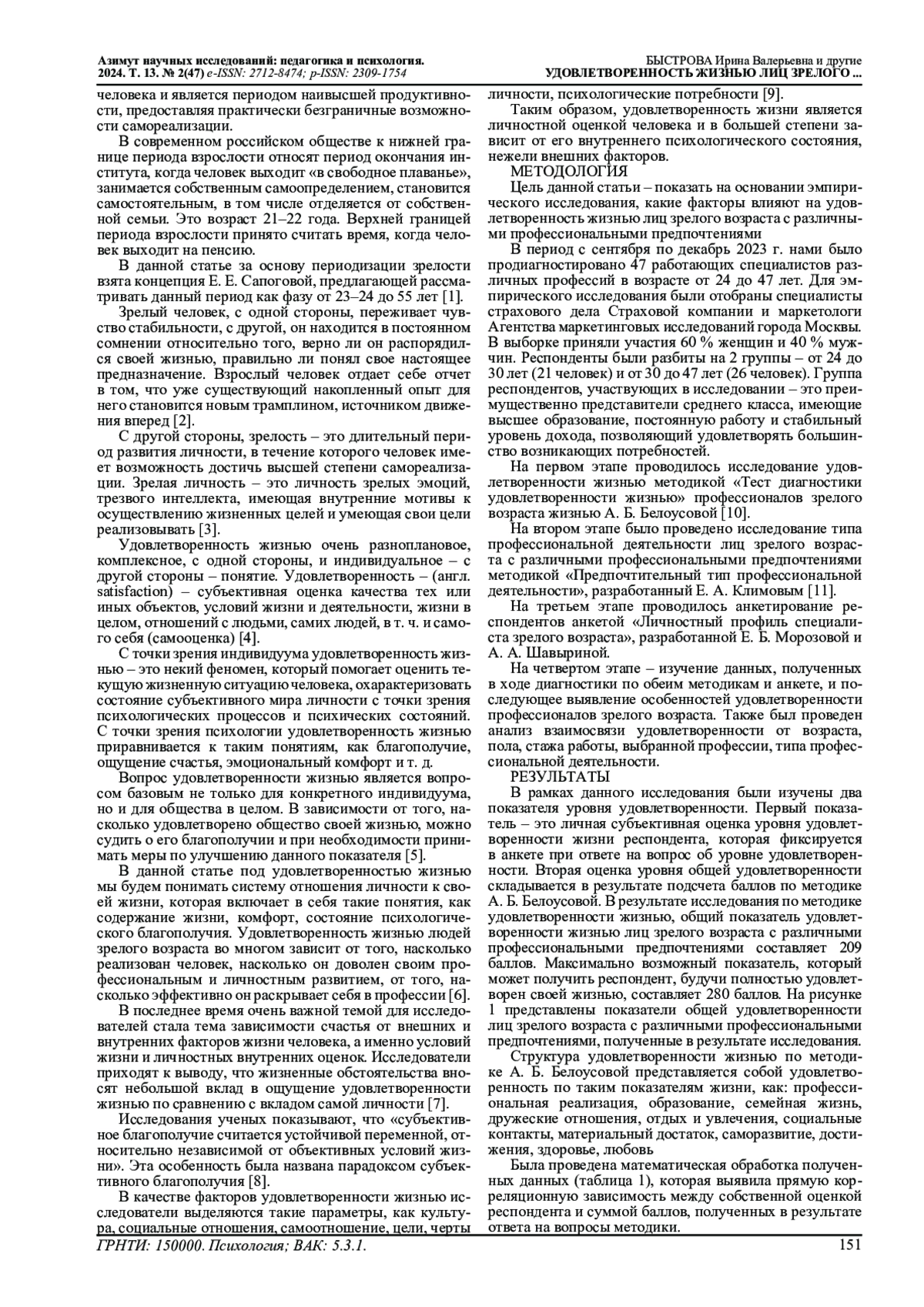 Человеку на всех этапах жизненного пути свойственно стремление к благополучию, счастью, внешнему и внутреннему комфорту. Важно находиться в согласии с собой, в состоянии внутреннего баланса, быть удовлетворенным своей деятельностью, работой, семьей, личной самореализацией. В связи с вышеизложенным нами была выдвинута гипотеза - является ли удовлетворенность жизнью показателем внутренней субъективной оценки лиц зрелого возраста с различными профессиональными предпочтениями и зависит ли удовлетворенность жизнью от социальных показателей. Для подтверждения гипотезы исследована зависимость удовлетворенности от возраста, пола, стажа работы, выбранной профессии, типа профессиональной деятельности. Сбор эмпирических данных проходил в форме тестирования по следующим направлениям: рассматривались типы профессиональной деятельности лиц зрелого возраста с различными профессиональными предпочтениями и их удовлетворенность жизнью, а также личностный профиль специалиста зрелого возраста. В рамках проведенного исследования были выявлены различия между уровнем удовлетворенности жизнью в зависимости от возраста. Так, уровень удовлетворенности в период ранней зрелости значительно выше, чем уровень удовлетворенности жизнью у лиц зрелого возраста с различными профессиональными предпочтениями в период средней и поздней зрелости. Полученные результаты показали, что профессионалам зрелого возраста свойственен высокий уровень удовлетворенности жизнью. Это субъективная составляющая внутренний жизни человека, которая не зависит от материальных и социальных факторов, на которую оказывают влияние биологические факторы (в данном случае возраст и пол).