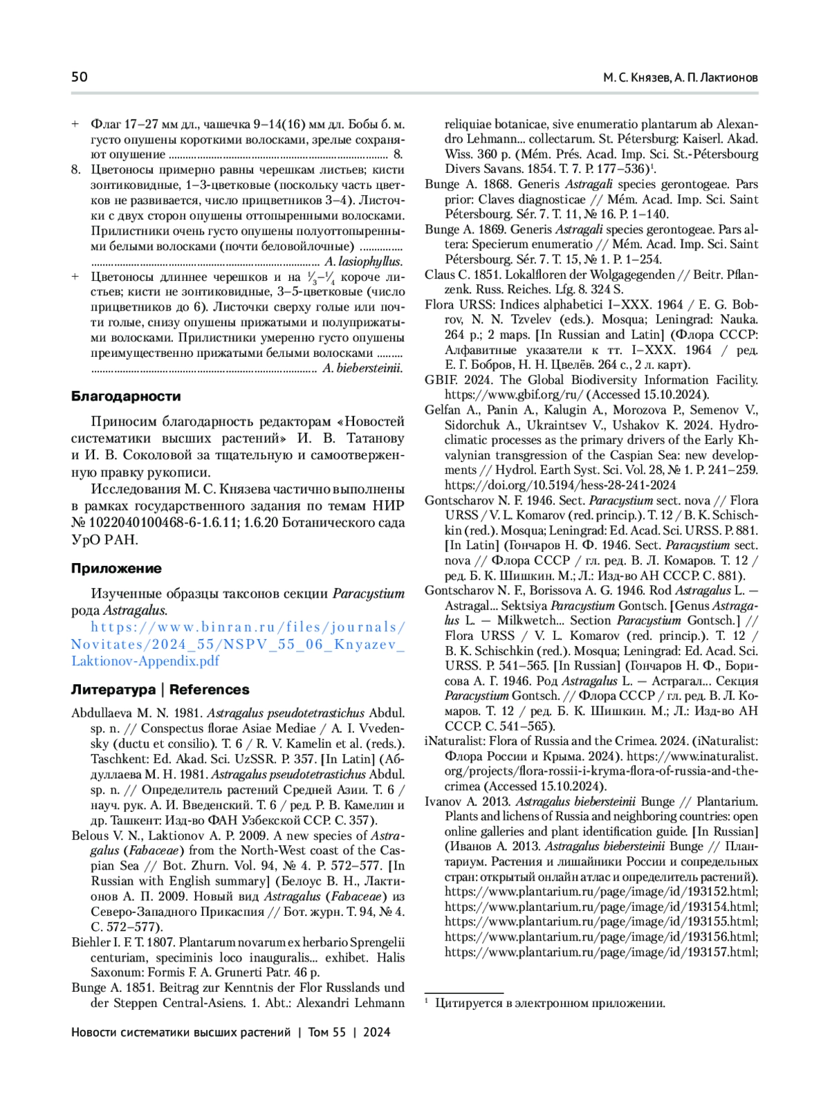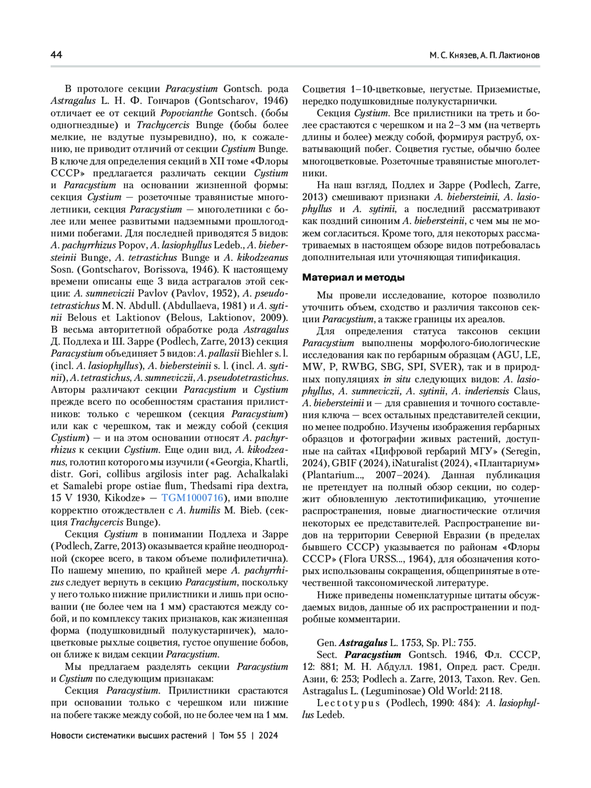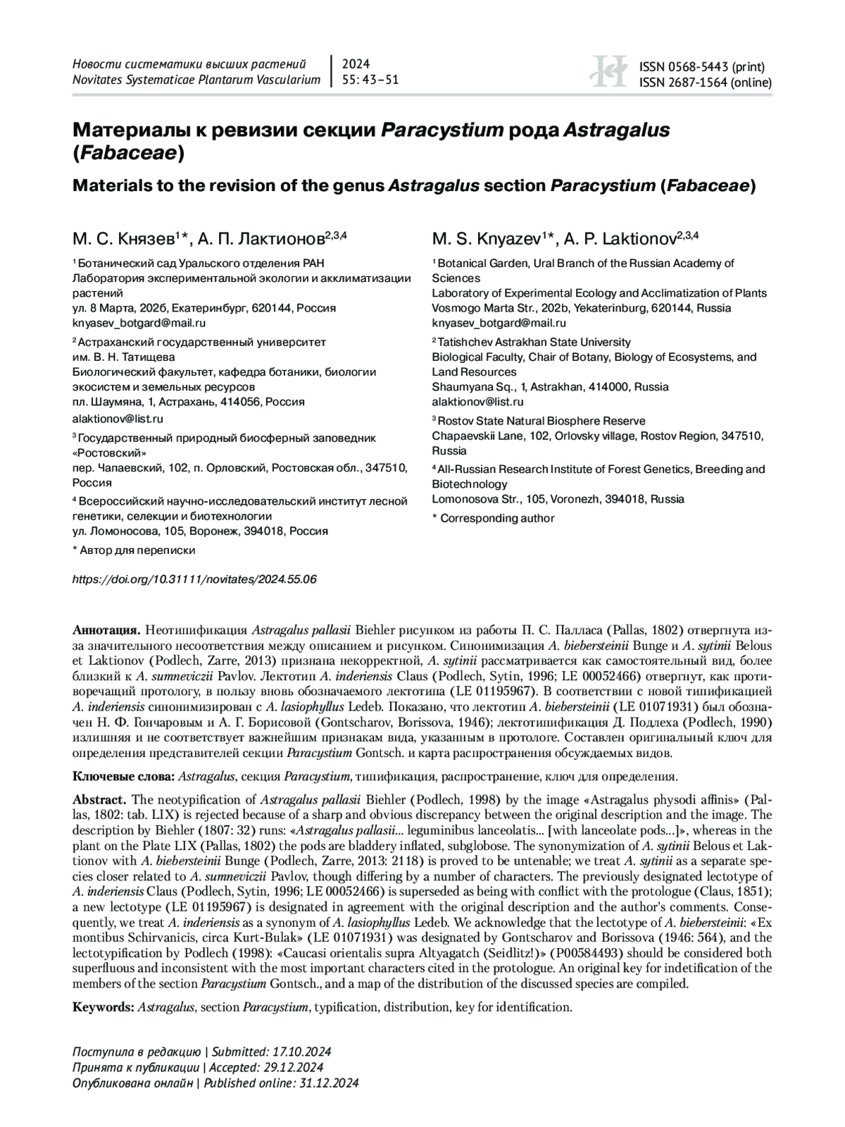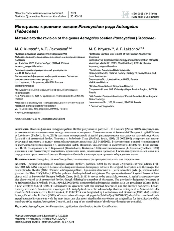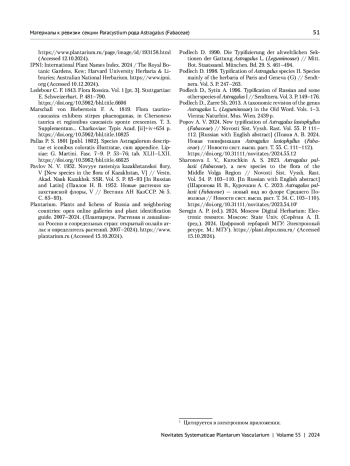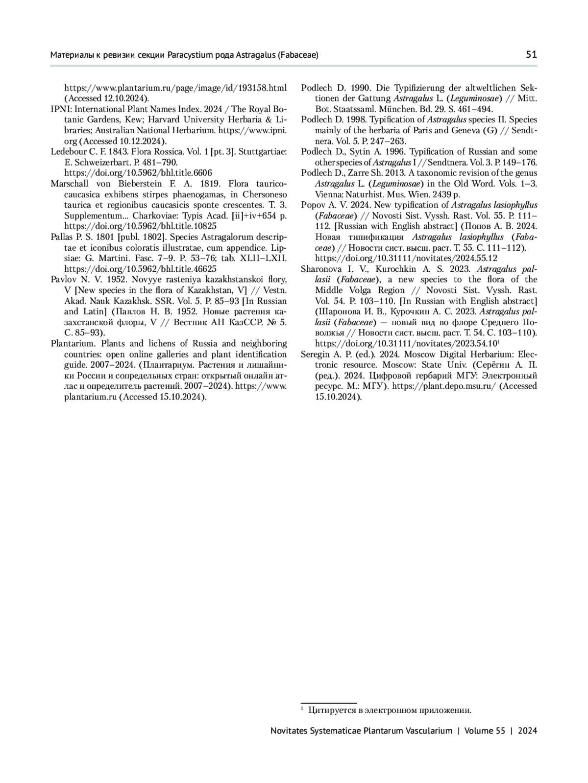 24. Popov A. V. 2024. New typification of Astragalus lasiophyllus (Fabaceae) // Novosti Sist. Vyssh. Rast. Vol. 55. P 111112.