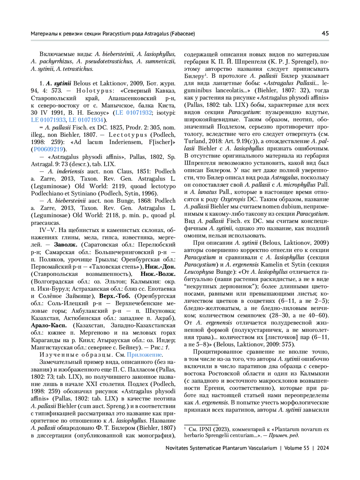 Неотипификация Astragalus pallasii Biehler рисунком из работы П. С. Палласа (Pallas, 1802) отвергнута изза значительного несоответствия между описанием и рисунком. Синонимизация A. biebersteinii Bunge и A. sytinii Belous et Laktionov (Podlech, Zarre, 2013) признана некорректной, A. sytinii рассматривается как самостоятельный вид, более близкий к A. sumneviczii Pavlov. Лектотип A. inderiensis Claus (Podlech, Sytin, 1996; LE 00052466) отвергнут, как противоречащий протологу, в пользу вновь обозначаемого лектотипа (LE 01195967). В соответствии с новой типификацией A. inderiensis синонимизирован с A. lasiophyllus Ledeb. Показано, что лектотип A. biebersteinii (LE 01071931) был обозначен Н. Ф. Гончаровым и А. Г. Борисовой (Gontscharov, Borissova, 1946); лектотипификация Д. Подлеха (Podlech, 1990) излишняя и не соответствует важнейшим признакам вида, указанным в протологе. Составлен оригинальный ключ для определения представителей секции Paracystium Gontsch. и карта распространения обсуждаемых видов.
