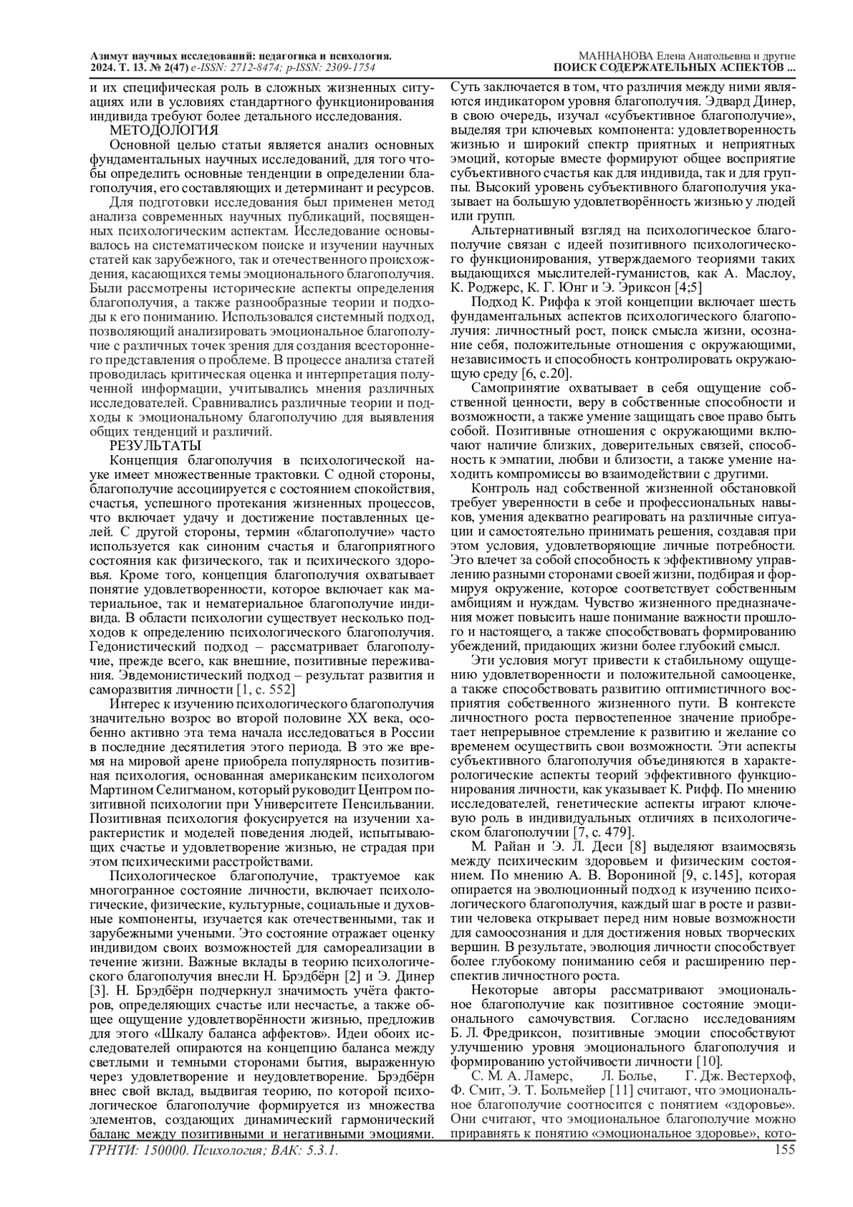 9. Воронина А.В. Проблема психического здоровья и благополучия человека: обзор концепций и опыт структурно-уровневого анализа // СПЖ. 2005. № 21. С. 141- 147. EDN: KPYURD