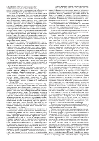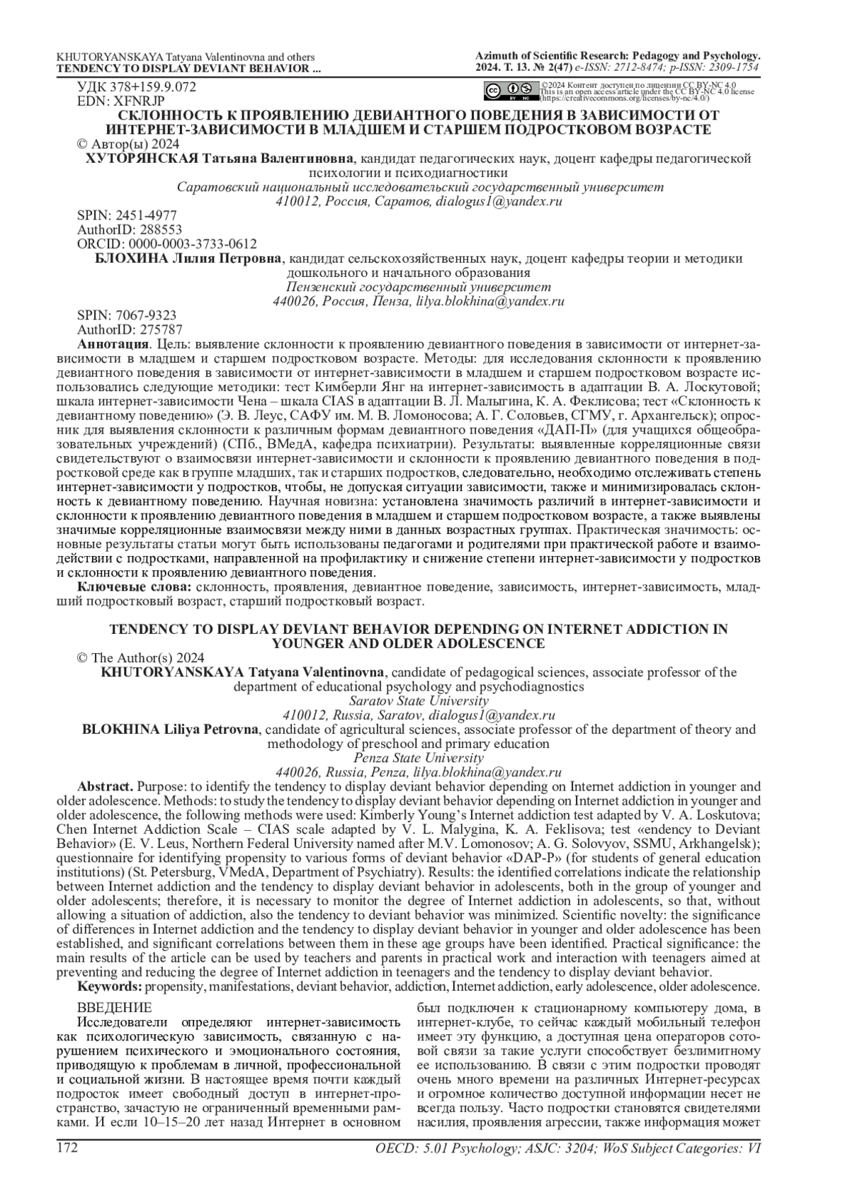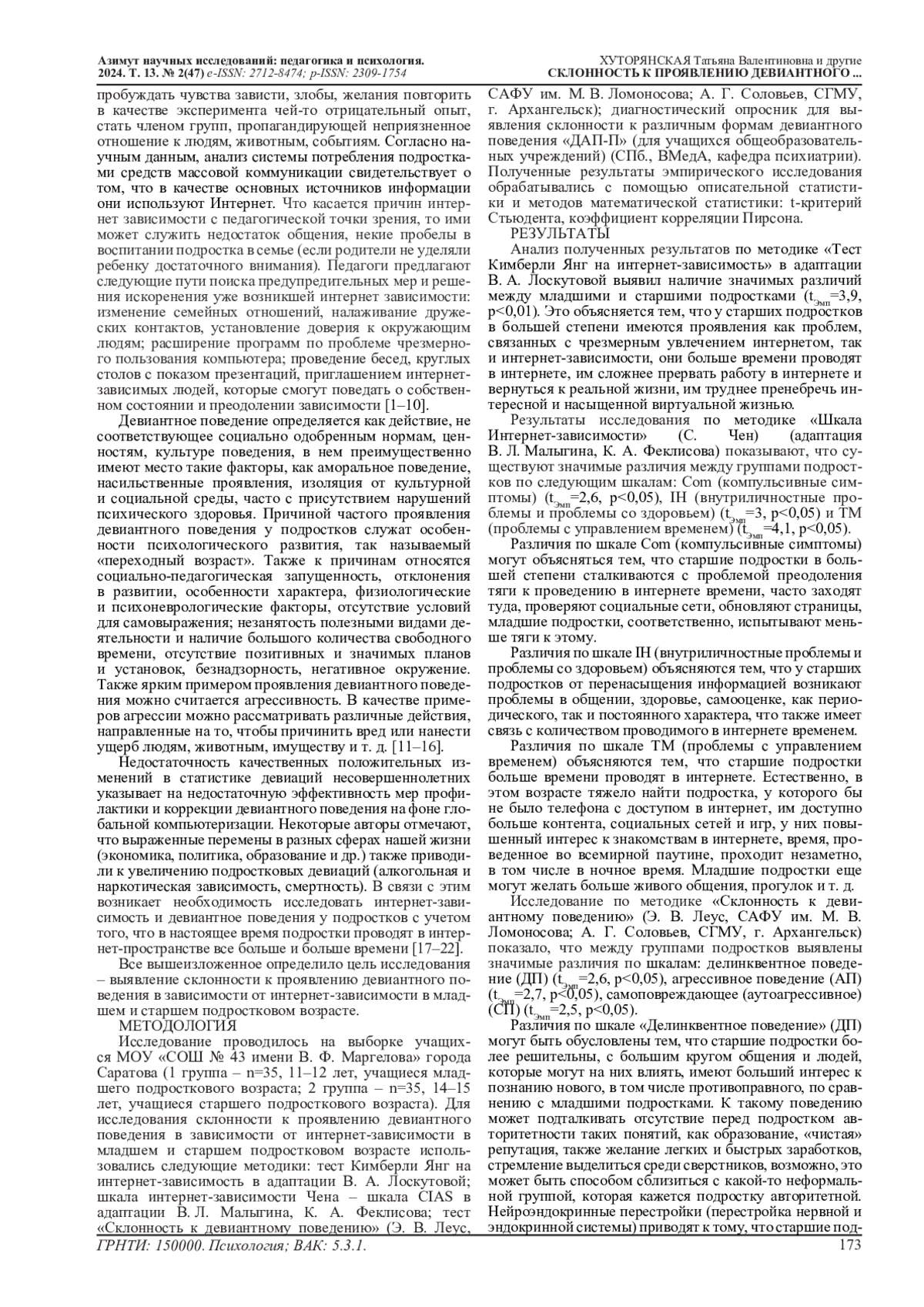 Результаты: выявленные корреляционные связи свидетельствуют о взаимосвязи интернет-зависимости и склонности к проявлению девиантного поведения в подростковой среде как в группе младших, так и старших подростков, следовательно, необходимо отслеживать степень интернет-зависимости у подростков, чтобы, не допуская ситуации зависимости, также и минимизировалась склонность к девиантному поведению.