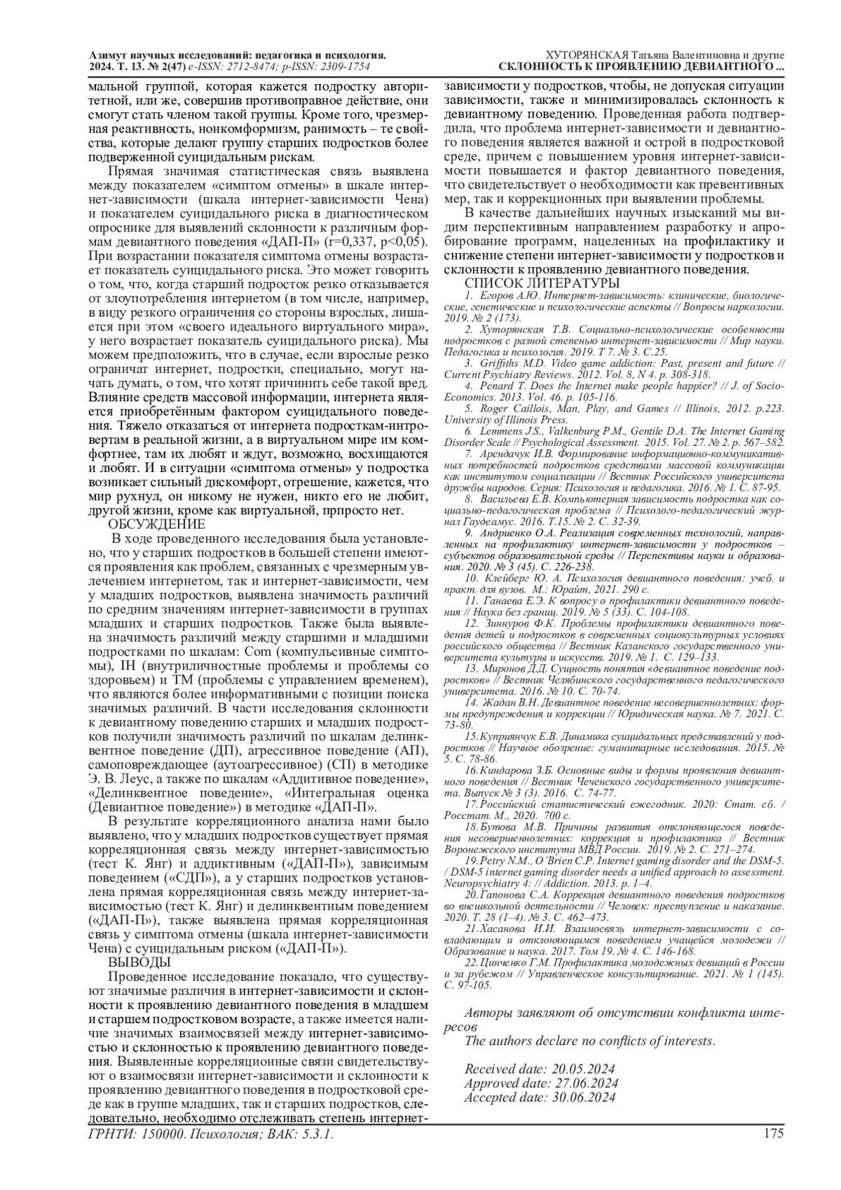 2. Хуторянская Т.В. Социально-психологические особенности подростков с разной степенью интернет-зависимости // Мир науки. Педагогика и психология. 2019. Т 7. № 3. С.25. EDN: EQFBUZ
