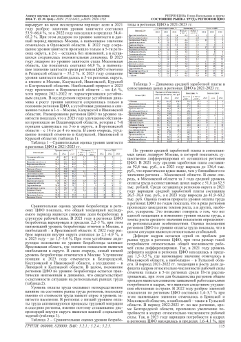 Развитие кадрового потенциала страны входит в число основных приоритетов стратегического развития, поскольку обеспечение рынка труда высококвалифицированными кадрами является одним из факторов обеспечения экономического роста. Для современного рынка труда России характерны такие проблемы, как низкая занятость населения, которая едва превышает 60% от общей численности экономически активного населения. При этом уровень зарегистрированной безработицы также находится на достаточно низком уровне. Российский рынок труда имеет ряд системных проблем, обусловленных географической протяжённостью, специфическими особенностями экономики и менталитета населения. В ходе исследования проведен анализ основных параметров рынка труда в регионах ЦФО в 2021-2023 гг., выявлены общие для округа тенденции, их причины и социально-экономические последствия. Установлено, что для регионов ЦФО в исследуемом периоде характерно сохранение общероссийских трендов, при этом внутри округа отмечены диспропорций по основным показателям развития рынка. Уровень занятости в регионах ЦФО в 2023 году варьировал в пределах 55-65%, а уровень безработицы - в пределах 1,5-3,4%. Ожидаемо, наиболее благоприятная ситуация сохраняется в Москве, которая является крупнейшим в стране рынком труда и, вместе с тем, характеризуется дифференцировано высоким средним уровнем оплаты труда, достигшим в 2023 году 136,4 тыс. рублей. Уровень потребности в кадрах в регионах ЦФО в 2023 году показывал динамику к росту и находился в пределах 1,-4,1% от численности рабочей силы. Снижение существующих диспропорций, как и прежде, остается важной задачей, в решении которой помимо региональных властей первостепенную роль играет осуществление мер государственной поддержки по созданию новых рабочих мест с высоким уровнем оплаты труда.