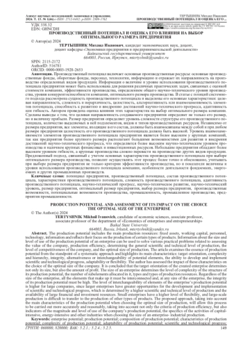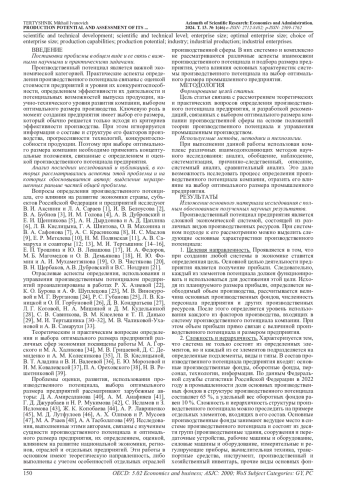 Производственный потенциал включает основные производственные ресурсы: основные производственные фонды, оборотные фонды, персонал, технологии, информацию и отражает их направленность на производство определенных видов продукции. Информация о величине и уровне использования производственного потенциала предприятия может быть использована для решения различных практических задач, связанных с оценкой стоимости компании, эффективности производства, определением общего научно-технического уровня производства, уровня конкурентоспособности компании, оптимального размера производства. В статье с позиций системного подхода рассмотрена сущность производственного потенциала и выделены его основные характеристики: целевая направленность, сложность и иерархичность, целостность, альтернативность или взаимозаменяемость элементов потенциала, способность к развитию и внедрению достижений научно-технического прогресса, адаптивность или гибкость. Автором проведена оценка влияния этих характеристик на выбор оптимального размера компании. Сделаны выводы о том, что целевая направленность создаваемого предприятия определяет не только его размер, но и величину прибыли. Размер предприятия определяет уровень сложности структуры его производственного потенциала, количество выделяемых в ней подэлементов, видов и типов производственных ресурсов. Независимо от размера предприятия, все элементы, входящие в его состав, должны быть взаимосвязаны между собой и при любом размере предприятия целостность его производственного потенциала должна быть высокой. Уровень взаимозаменяемости элементов производственного потенциала предприятия является более высоким у крупных компаний, так как предприятия более крупного размера располагают большими возможностями для развития и внедрения достижений научно-технического прогресса, что определяется более высоким научно-техническим уровнем производства и наличием крупных финансовых и инвестиционных ресурсов. Небольшие предприятия обладают более высоким уровнем гибкости, а крупные производства сложно перевести на производство других видов продукции. Предложенный подход, связанный с учетом основных характеристик производственного потенциала при выборе оптимального размера производства позволит осуществлять этот процесс более точно и обоснованно, учитывать при выборе размера предприятия не только критерии эффективности производства, но и показатели величины и уровня использования производственного потенциала компании, особенности деятельности фондоемких, энергоемких и других промышленных производств.