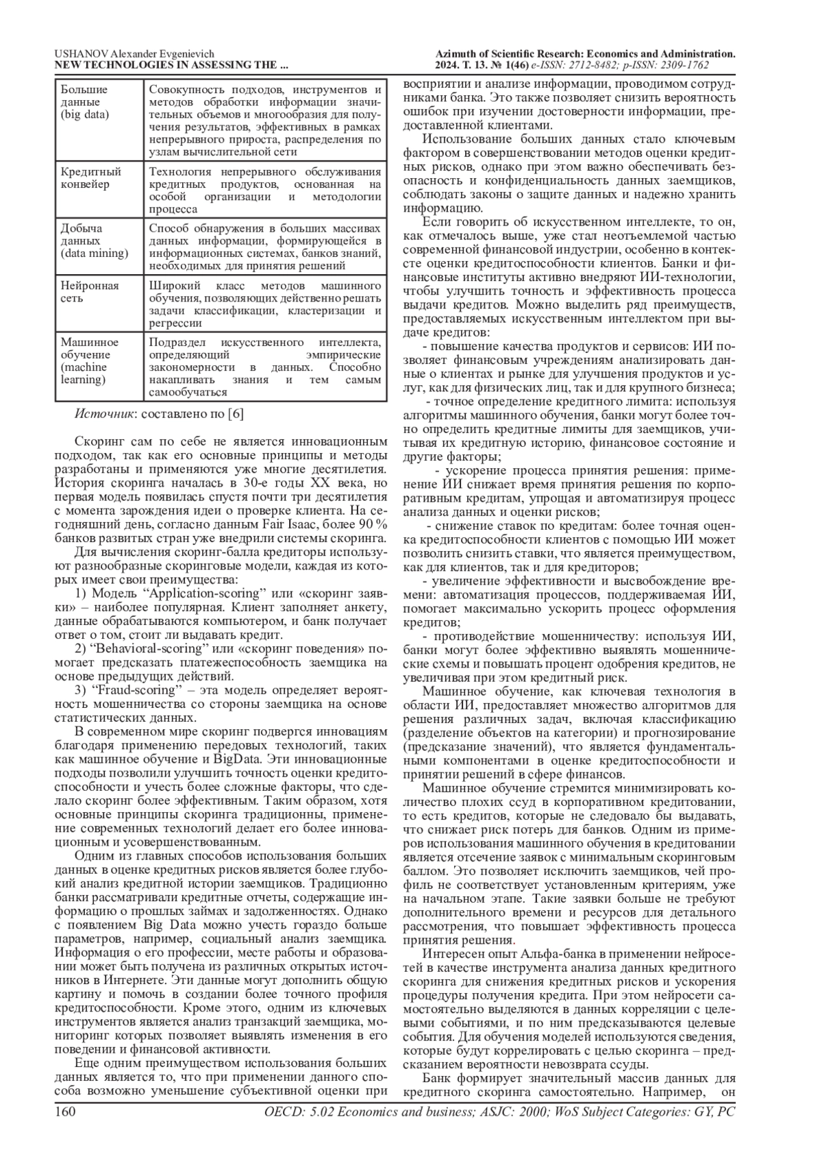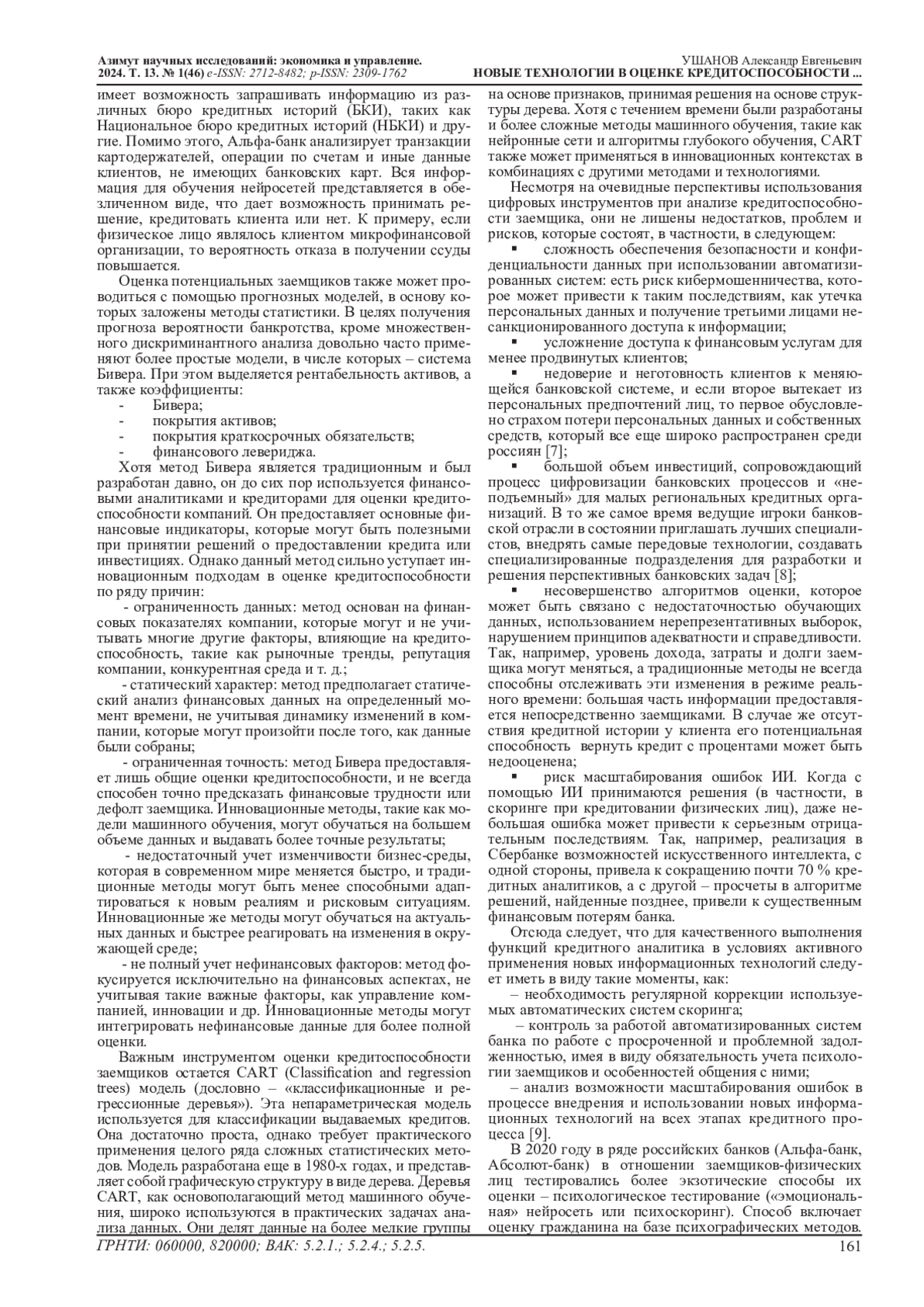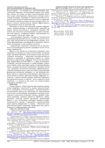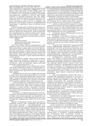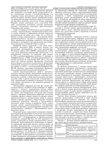 2. Кривошапова С.В., Горьков А. Перспективы использования новых цифровых технологий в сфере управления кредитным риском и оценки кредитоспособности // Азимут научных исследований: экономика и управление. 2021. T.10. №4(37). С. 96-99. EDN: SVZPWU