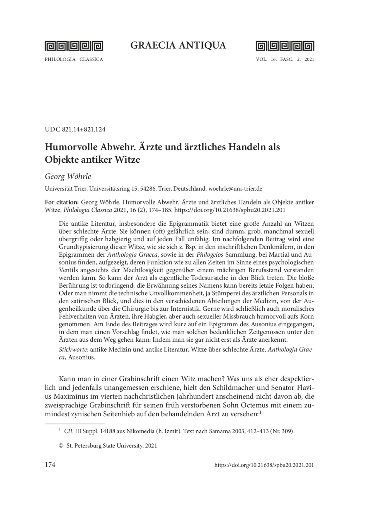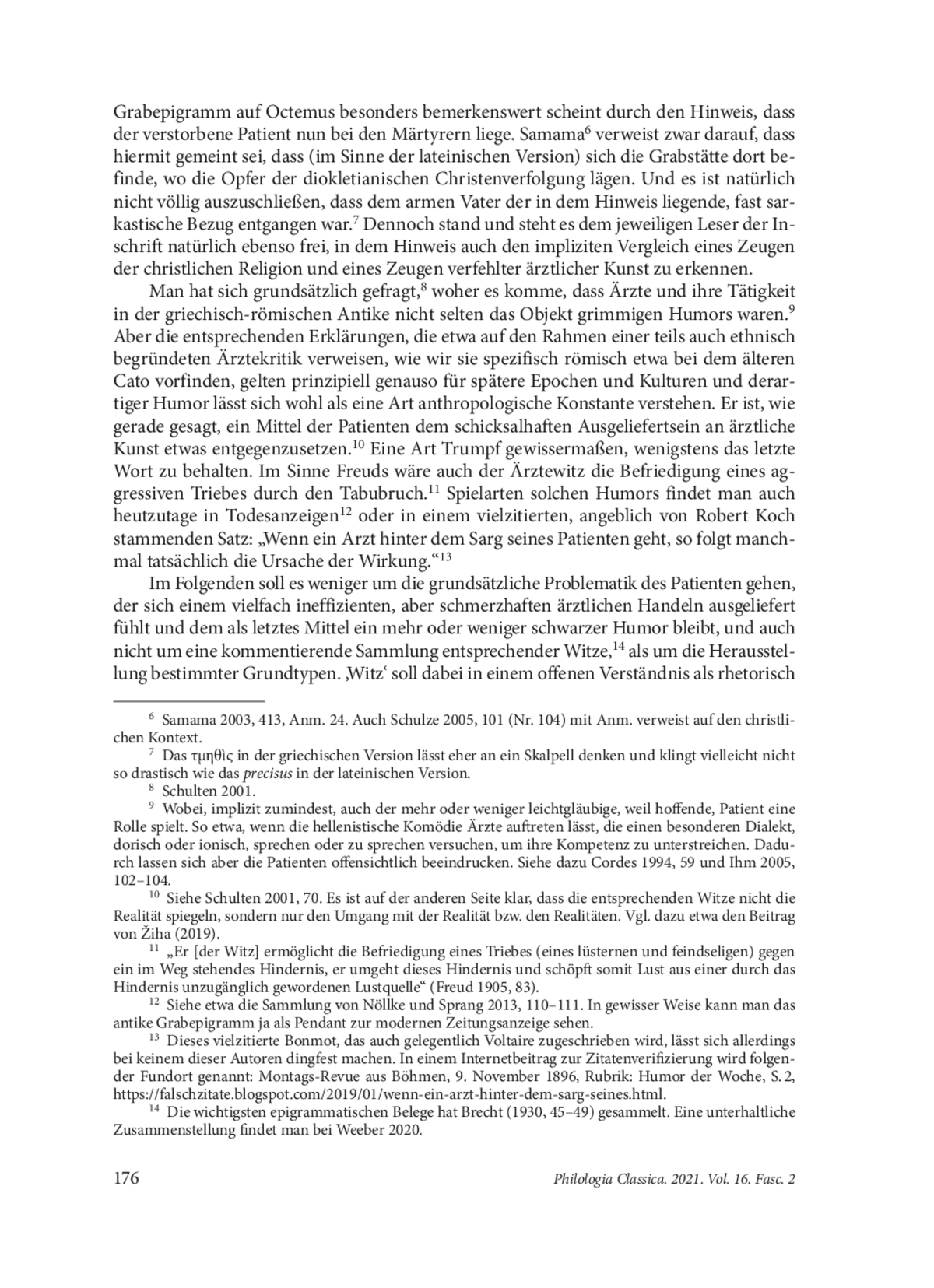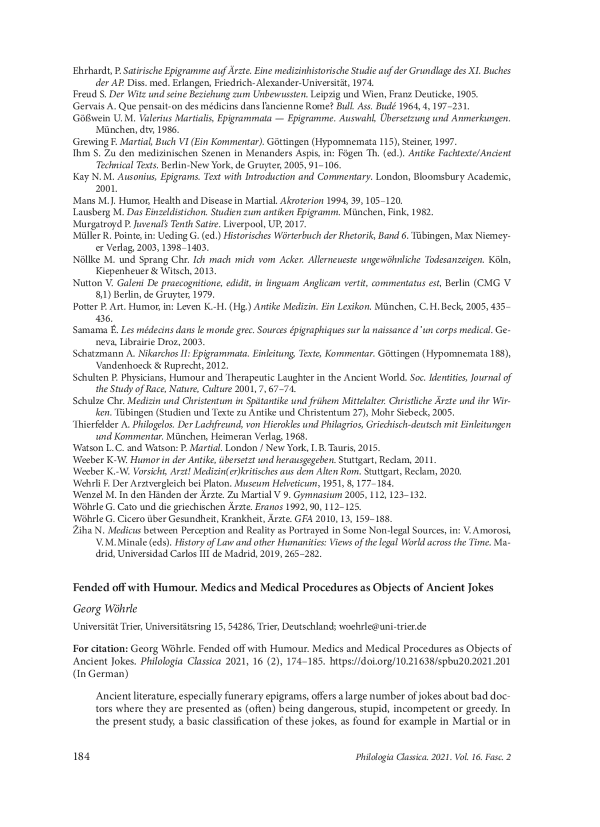 Die antike Literatur, insbesondere die Epigrammatik bietet eine große Anzahl an Witzen über schlechte Ärzte. Sie können (oft) gefährlich sein, sind dumm, grob, manchmal sexuell übergriffig oder habgierig und auf jeden Fall unfähig. Im nachfolgenden Beitrag wird eine Grundtypisierung dieser Witze, wie sie sich z. Bsp. in den inschriftlichen Denkmälern, in den Epigrammen der Anthologia Graeca, sowie in der Philogelos-Sammlung, bei Martial und Ausonius finden, aufgezeigt, deren Funktion wie zu allen Zeiten im Sinne eines psychologischen Ventils angesichts der Machtlosigkeit gegenüber einem mächtigen Berufsstand verstanden werden kann. So kann der Arzt als eigentliche Todesursache in den Blick treten. Die bloße Berührung ist todbringend; die Erwähnung seines Namens kann bereits letale Folgen haben. Oder man nimmt die technische Unvollkommenheit, ja Stümperei des ärztlichen Personals in den satirischen Blick, und dies in den verschiedenen Abteilungen der Medizin, von der Augenheilkunde über die Chirurgie bis zur Internistik. Gerne wird schließlich auch moralisches Fehlverhalten von Ärzten, ihre Habgier, aber auch sexueller Missbrauch humorvoll aufs Korn genommen. Am Ende des Beitrages wird kurz auf ein Epigramm des Ausonius eingegangen, in dem man einen Vorschlag findet, wie man solchen bedenklichen Zeitgenossen unter den Ärzten aus dem Weg gehen kann: Indem man sie gar nicht erst als Ärzte anerkennt