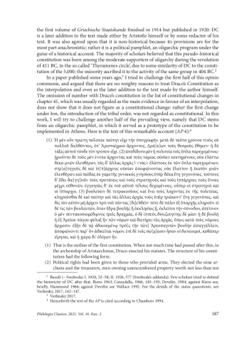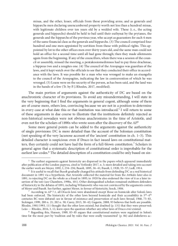 The constitution, which according to the fourth chapter of the Athenaion Politeia by Aristotle1 (henceforth AP) was implemented by the famous legislator Draco (henceforth DC), became the subject of hot debates immediately after the publication of the papyrus text in 1891. Scholars discussed both the historicity of this constitutional order which is otherwise practically unknown to ancient tradition, and its authenticity as a part of the treatise’s text.
