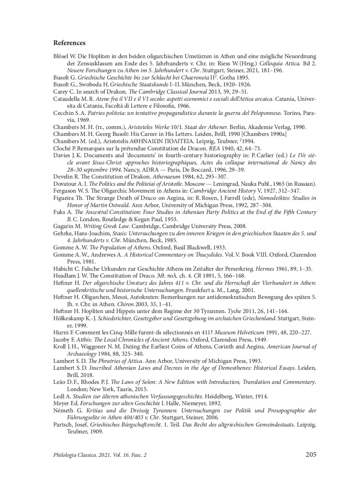 1. Blösel W. Die Hopliten in den beiden oligarchischen Umstürzen in Athen und eine mögliche Neuordnung der Zensusklassen am Ende des 5. Jahrhunderts v. Chr. in: Riess W. (Hrsg.) Colloquia Attica. Bd 2. Neuere Forschungen zu Athen im 5. Jahrhundert v. Chr. Stuttgart, Steiner, 2021, 181-196.