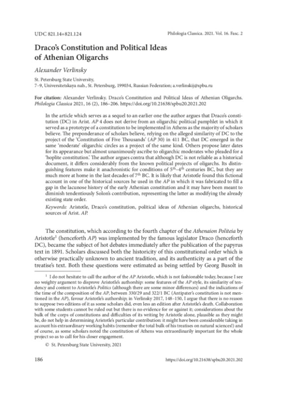 61. Verlinsky A. Draco’s Constitution in the Athenaion Politeia 4: Is It an Interpolation or an Author’s Later Addition? Hyperboreus, 2017, 23, 142-173. EDN: AHNYNU