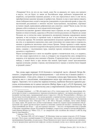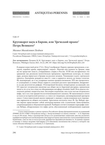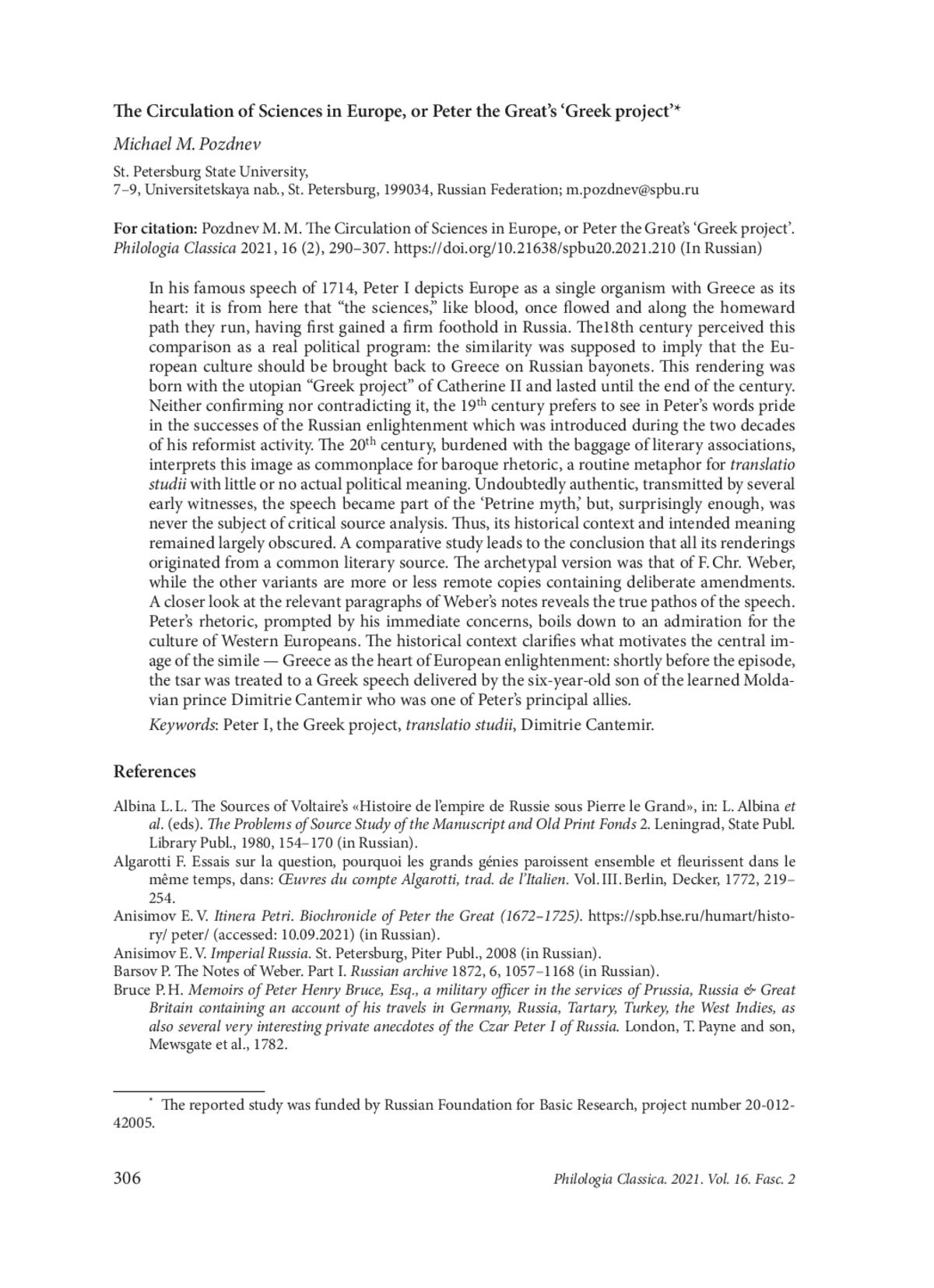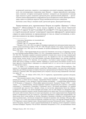 В широко известной речи 1714 г. Петр I изображает Европу единым организмом, в котором, подобно крови, циркулируют «науки». Некогда они изошли из Греции, сюда же им предстоит впасть, утвердившись сперва в России. XVIII век воспринимал это сравнение как реальную политическую программу: европейская культура, по плану царя, должна вернуться в Грецию на русских штыках. Толкование в духе «греческого проекта» Екатерины рождается вместе с ним и держится вплоть до конца столетия. Не подтверждая, но и не оспаривая мнения предшественников, XIX век предпочитает усматривать в словах Петра гордость успехами русского просвещения, внедренного за два десятилетия реформ. Отягощенный багажом литературных ассоциаций, век XX трактует петровскую аналогию как общее место барочной риторики, привычную эпохе и, по сути, ни к чему не обязывающую метафору translatio studii. Речь дошла в нескольких ранних свидетельствах. Бесспорно подлинная, она стала частью петровского мифа, так и не став предметом источниковедческого анализа. Не выясненным в итоге остался ее исторический контекст, а с ним и ее тенденция, запланированный оратором смысл. Сопоставительный анализ приводит к выводу о происхождении всех переданных вариантов из общего источника. Архетипом послужил текст Ф.-Хр. Вебера, прочие версии представляют собой непосредственные или ступенчатые заимствования, сопровождавшиеся обдуманной правкой. Разбирая соответствующие параграфы записок Вебера, обнаруживаем что пафос речи, обусловленный злободневными задачами петровской политики, сводится к восхищению культурой западных европейцев. Понять, чем мотивирована стержневая идея (Греция — сердце европейского просвещения), помогает историко-культурный контекст: незадолго до описываемого эпизода царь оказался в роли слушателя греческой речи, произнесенной ребенком — шестилетним сыном образованного в европейском духе молдавского князя Димитрия Кантемира, одного из наиболее дорогих Петру внешнеполитических союзников.