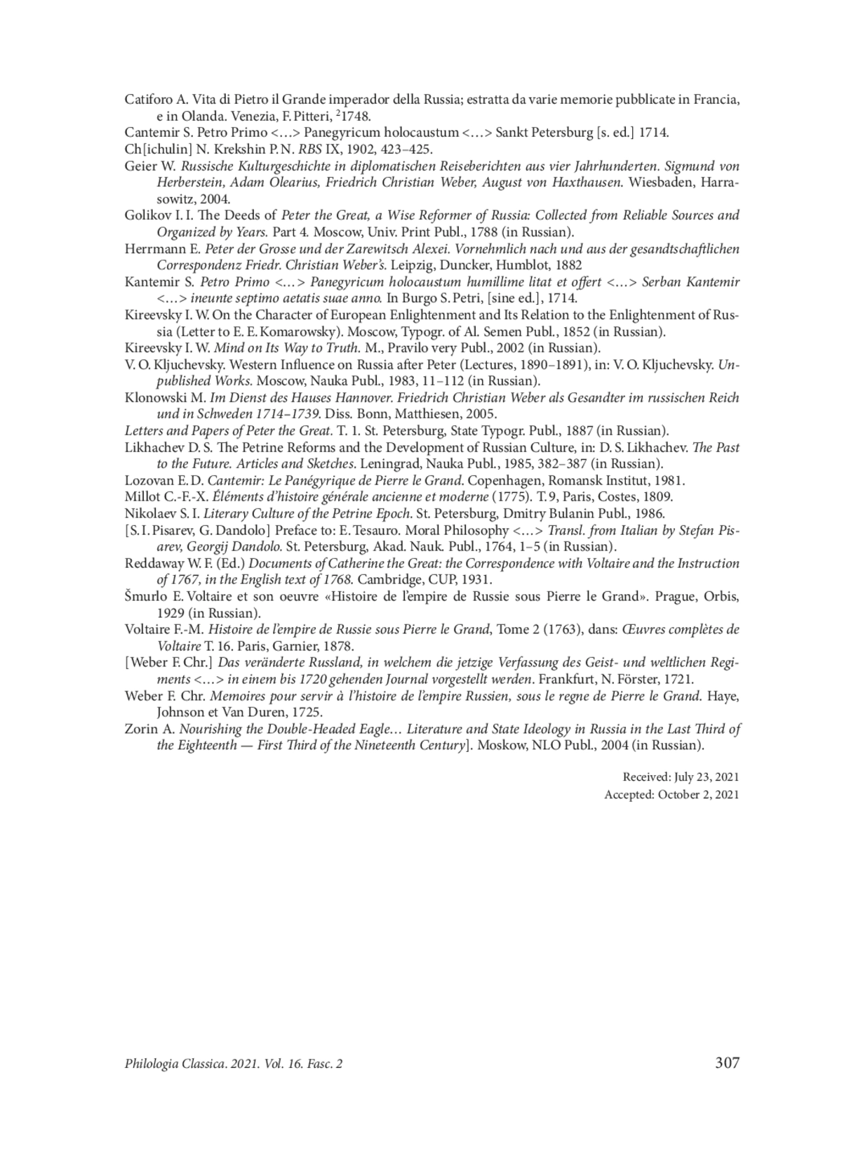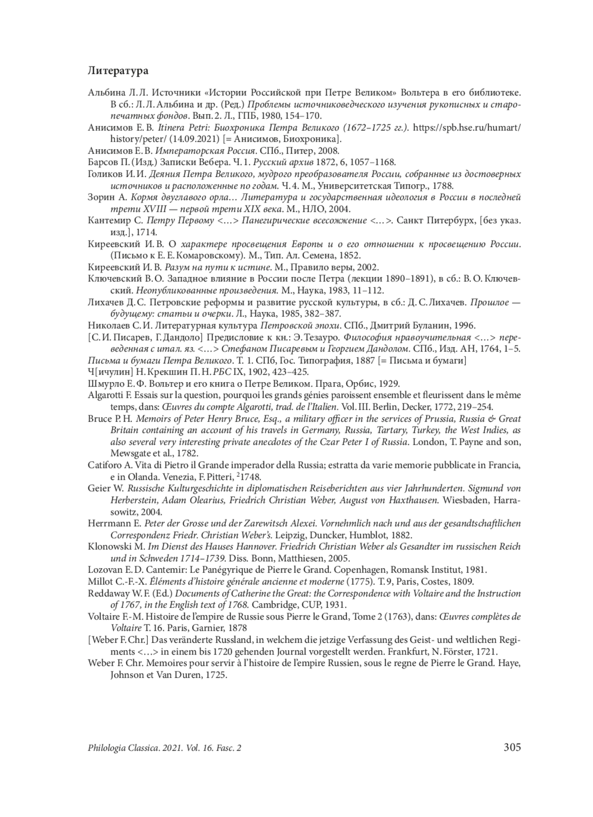 1. Альбина Л. Л. Источники “Истории Российской при Петре Великом” Вольтера в его библиотеке. В сб.: Л. Л. Альбина и др. (Ред.) Проблемы источниковедческого изучения рукописных и старопечатных фондов. Вып. 2. Л., ГПБ, 1980, 154-170.