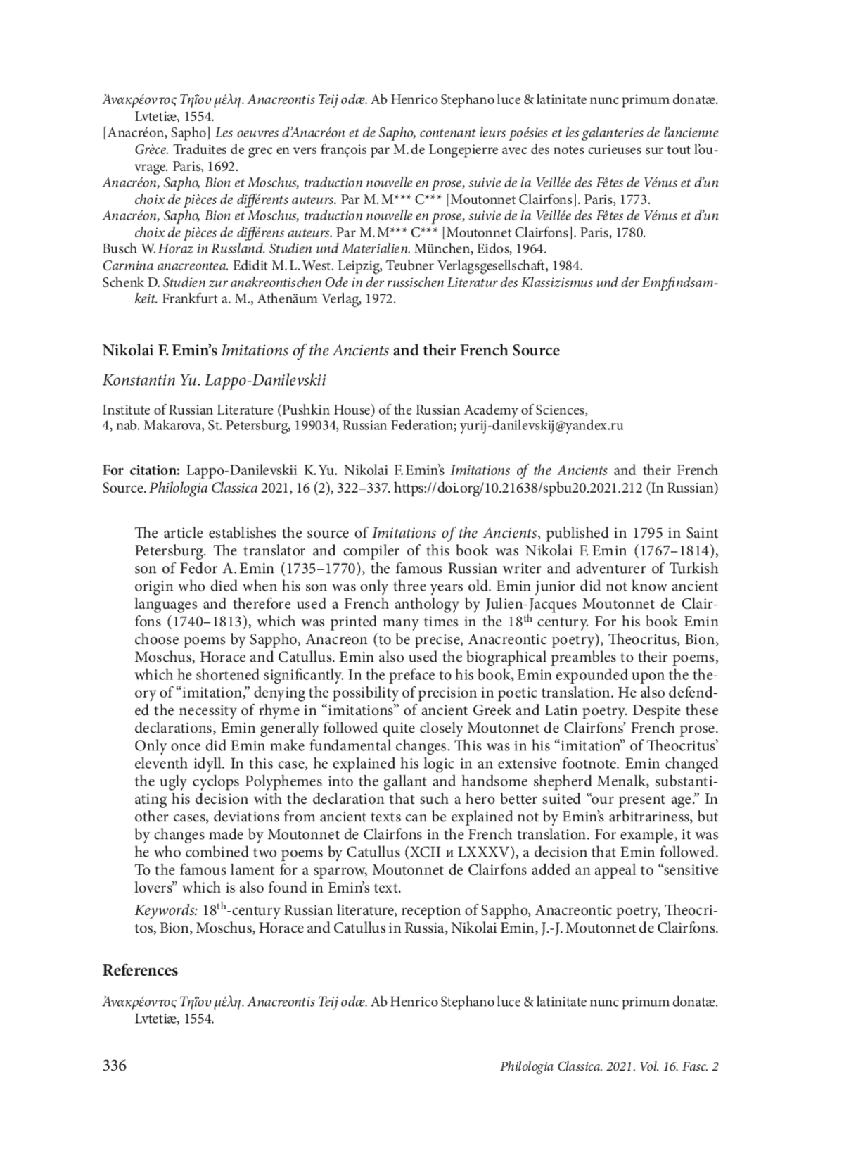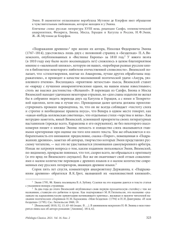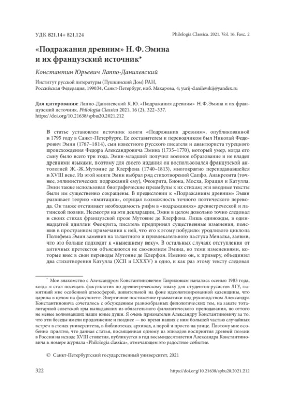 11. Лаппо-Данилевский К. Ю. “Стихотворения Сафы, лесбийския стихотворицы” (1792) И. И. Виноградова и их французский источник. Летняя школа по русской литературе. 2018, 14, 1, 14-26. EDN: XTAFKX