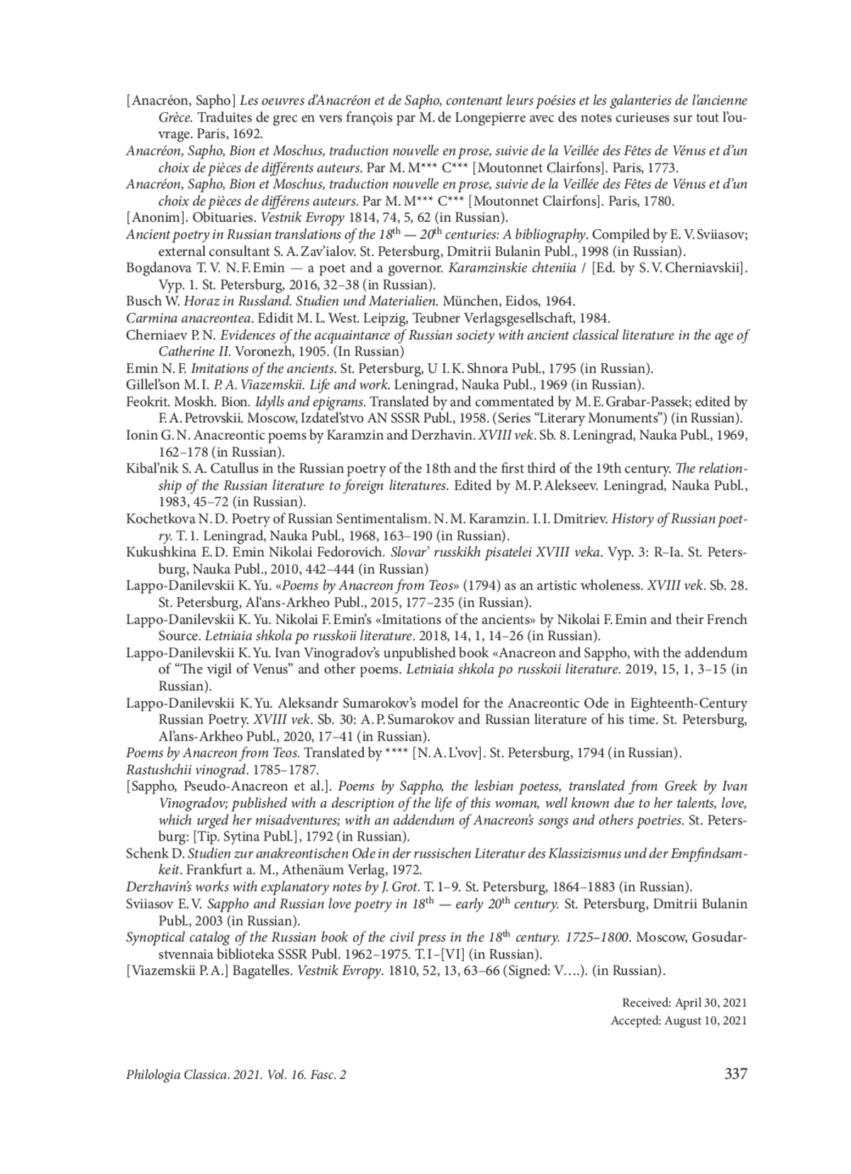 Лаппо-Данилевский К. Ю. “Стихотворение Анакреона Тийского” (1794) как художественное целое. XVIII век. Сб. 28. Санкт-Петербург, Альянс-Архео, 2015, 177-235. EDN: VXEOLB