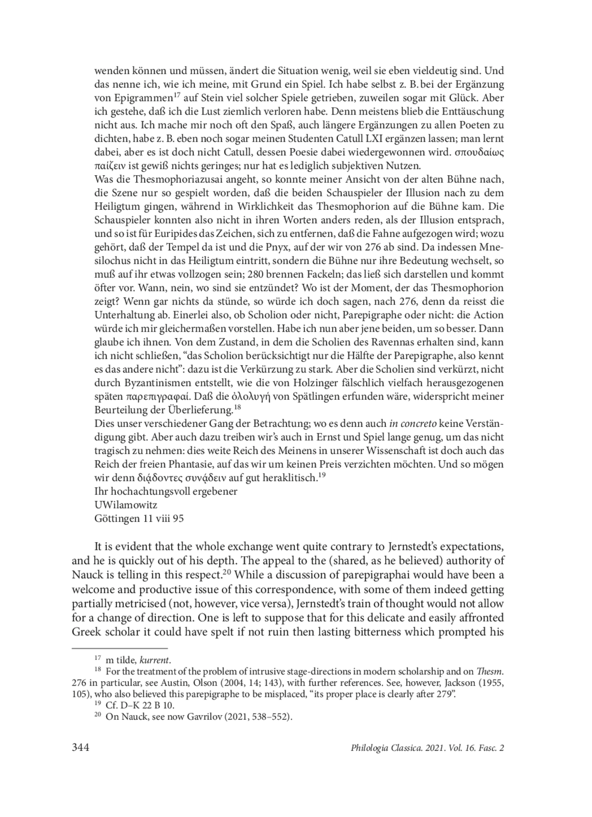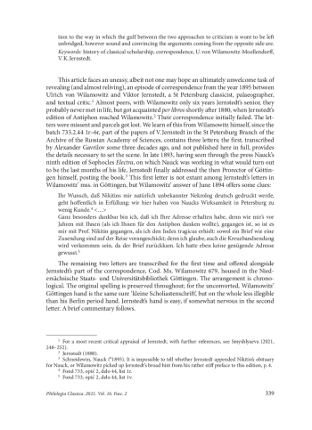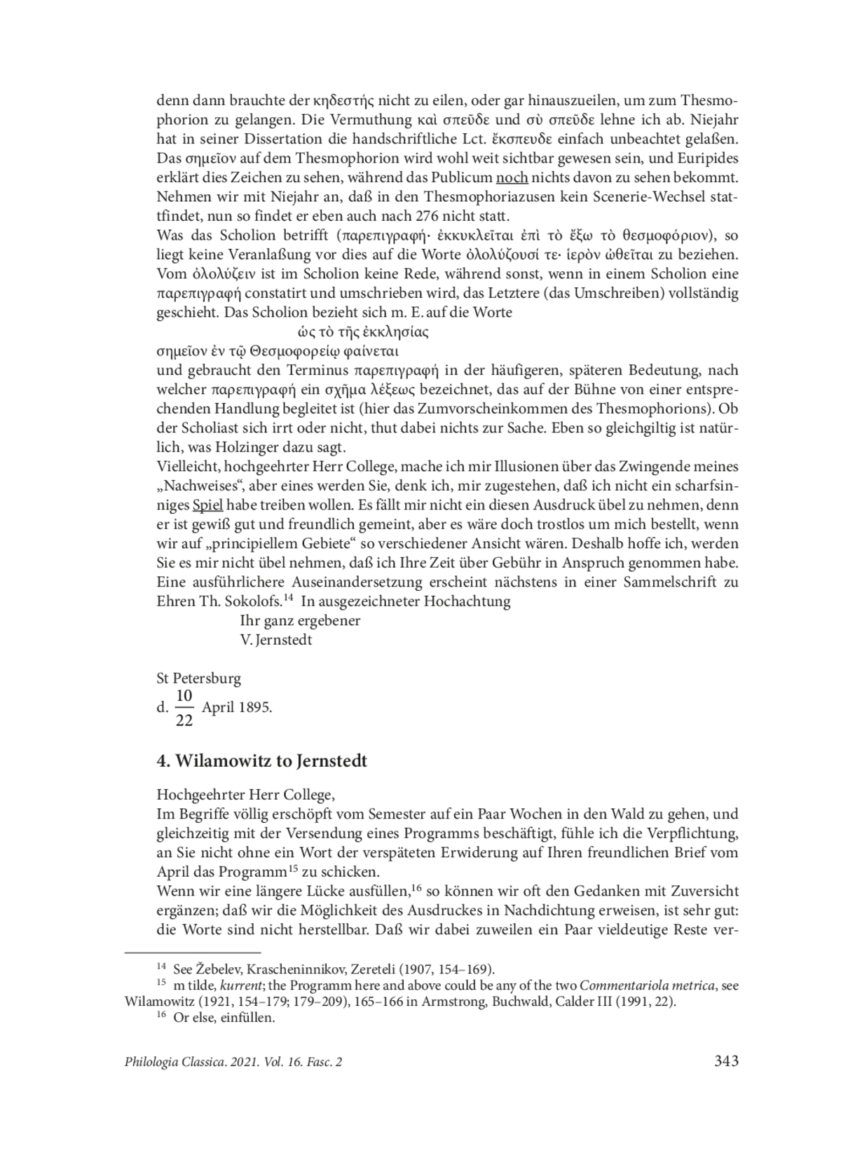 While working on the correspondence of Ulrich von Wilamowitz-Moellendorff with Russian scholars in the summer of 2021, the author discovered two letters of Viktor Jernstedt to Wilamowitz in the mss. collection of Niedersächsische Staats- und Universitätsbibliothek Göttingen. Wilamowitz’ part of this correspondence, three letters under the shelfmark call number 733.2.44 1r–6r, dated between June 1894 and August 1895, was likewise preserved among the papers of Jernstedt in the St Petersburg Branch of the Archive of the Russian Academy of Sciences. Jernstedt’s letters and Wilamowitz’ two replies are transcribed for the first time and published here. Some details that should aid understanding of the letters are offered in the notes. The transcription of Wilamowitz’ notoriously difficult hand is, even in the most hopeless cases, possible, and, apart from minor abiding problems, unequivocal. While abstaining from a full critical commentary on the problem of intrusive stage directions discussed in the letters, and not wishing to take sides, the author would like to draw the readers’ attention to the way in which the gulf between the two approaches to criticism is wont to be left unbridged, however sound and convincing the arguments coming from the opposite side are
