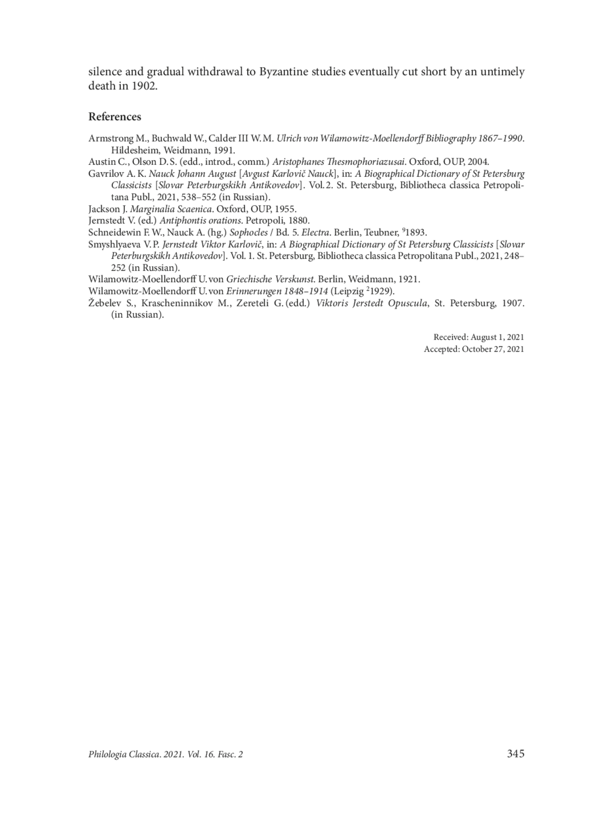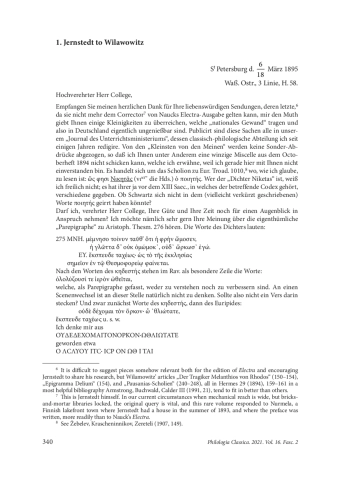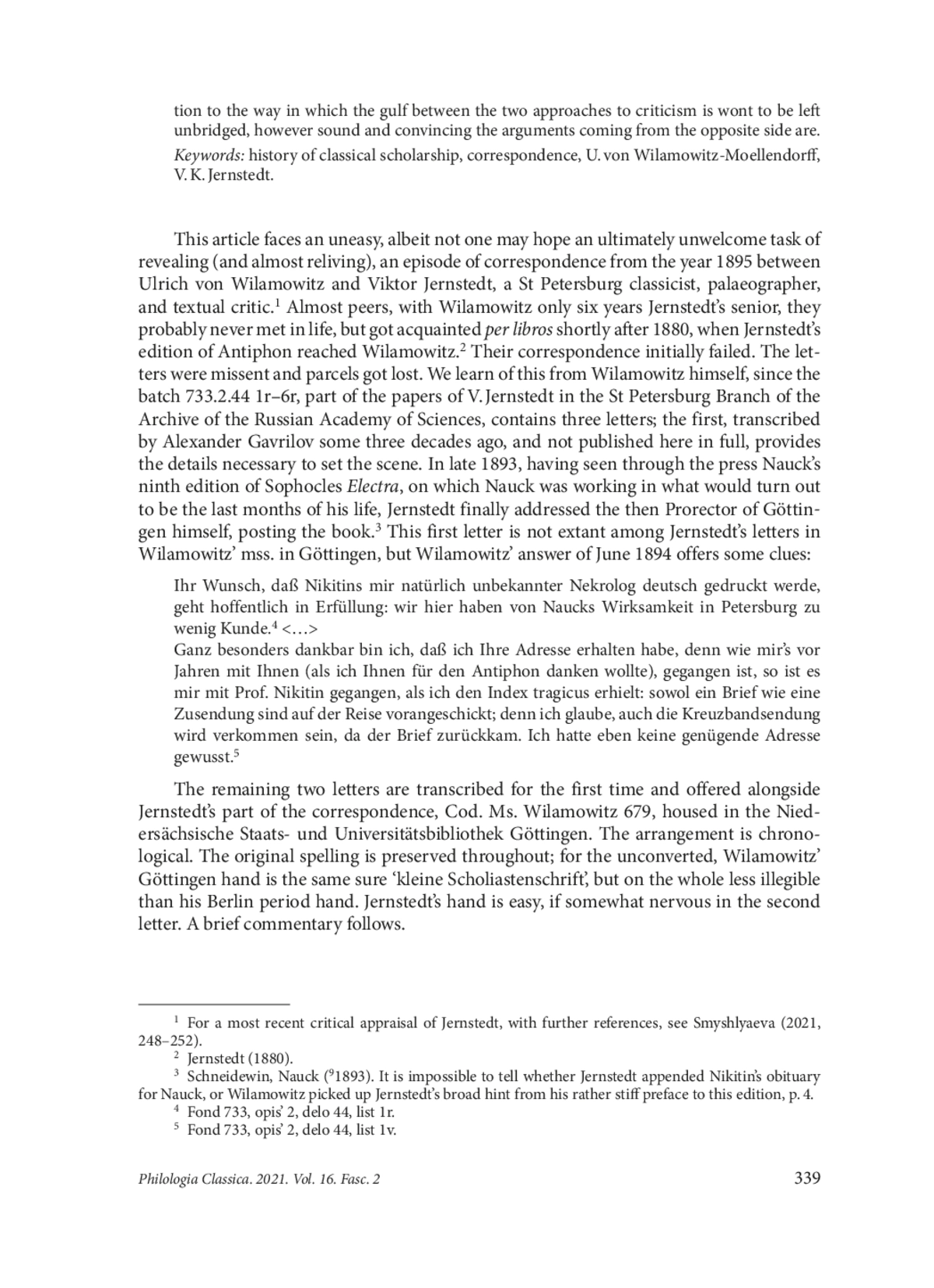 This article faces an uneasy, albeit not one may hope an ultimately unwelcome task of revealing (and almost reliving), an episode of correspondence from the year 1895 between Ulrich von Wilamowitz and Viktor Jernstedt, a St Petersburg classicist, palaeographer, and textual critic.1 Almost peers, with Wilamowitz only six years Jernstedt’s senior, they probably never met in life, but got acquainted per libros shortly after 1880, when Jernstedt’s edition of Antiphon reached Wilamowitz.2 Their correspondence initially failed. The letters were missent and parcels got lost. We learn of this from Wilamowitz himself, since the batch 733.2.44 1r–6r, part of the papers of V. Jernstedt in the St Petersburg Branch of the Archive of the Russian Academy of Sciences, contains three letters; the first, transcribed by Alexander Gavrilov some three decades ago, and not published here in full, provides the details necessary to set the scene. In late 1893, having seen through the press Nauck’s ninth edition of Sophocles Electra, on which Nauck was working in what would turn out to be the last months of his life, Jernstedt finally addressed the then Prorector of Göttingen himself, posting the book.