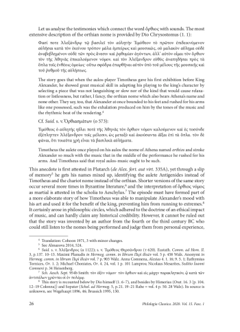 This paper continuous my reflections on the famous ancient musical composition known as ὄρθιος νόμος, which could be both citharodic and auletic. I have already argued1 that, in spite of what Pollux (4. 65), Hesychius (ο 1188 Latte) and the Suida (ο 575) claimed, this name was unlikely due to the piece’s rhythm. Modern scholars who do not accept Pollux’ explanation typically believe that ὄρθιος was a characteristic of pitch. 2 If true, then our understanding of the way in which pitch was indicated in ancient Greek must be called into question: the metaphor used for high pitch is generally agreed to be “sharp” (ὀξύς) — not “high”. Less numerous are those who link the name ὄρθιος to the overall character of the nome, and even here high pitch may be thought to form one of its characteristic features