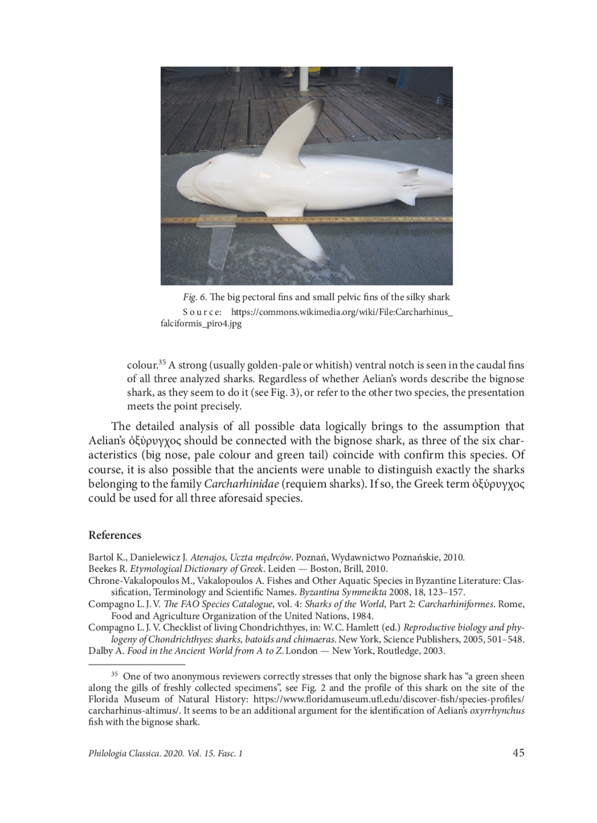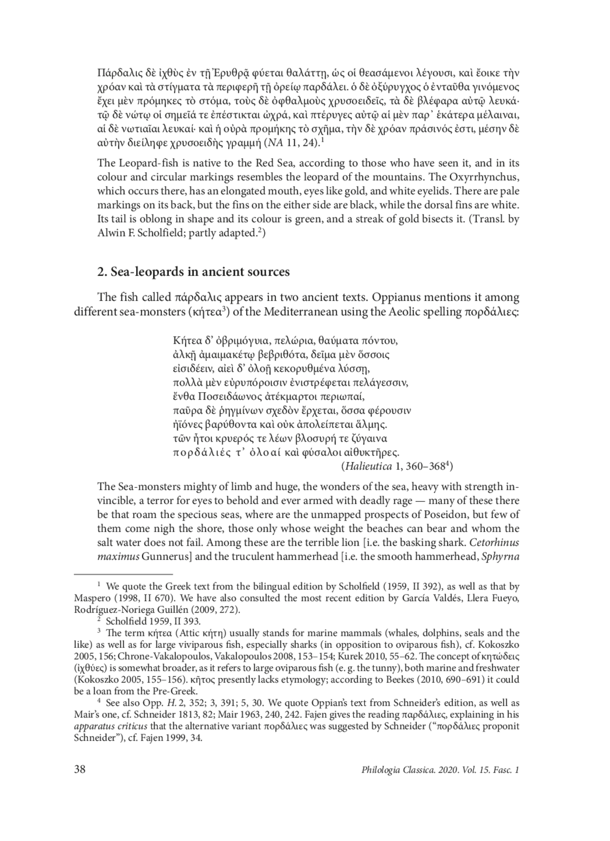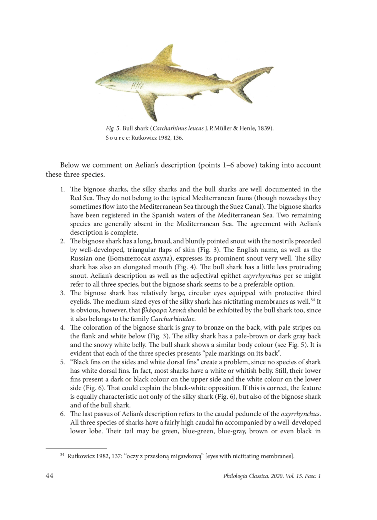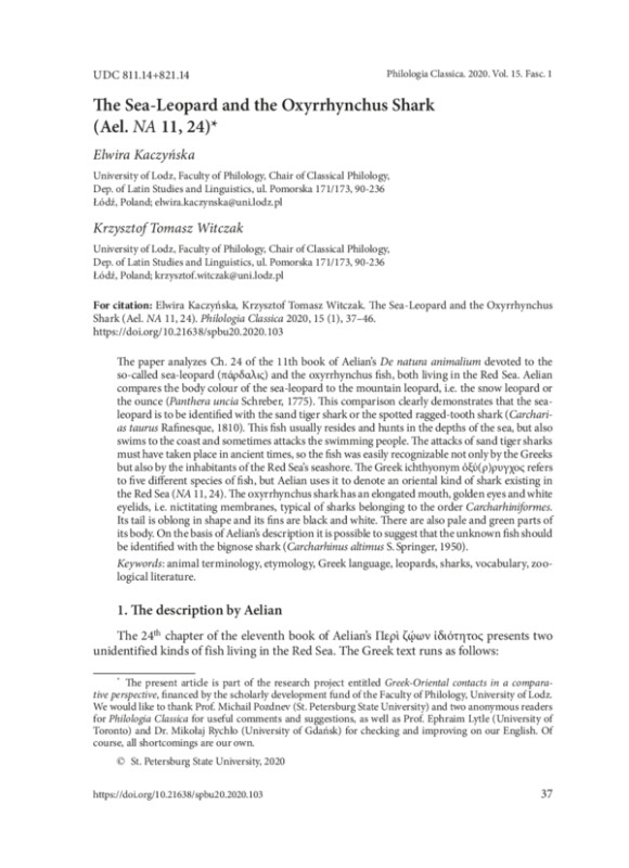 The paper analyzes Ch. 24 of the 11th book of Aelian’s De natura animalium devoted to the so-called sea-leopard (πάρδαλις) and the oxyrrhynchus fish, both living in the Red Sea. Aelian compares the body colour of the sea-leopard to the mountain leopard, i. e. the snow leopard or the ounce (Panthera uncia Schreber, 1775). This comparison clearly demonstrates that the sealeopard is to be identified with the sand tiger shark or the spotted ragged-tooth shark (Carcharias taurus Rafinesque, 1810). This fish usually resides and hunts in the depths of the sea, but also swims to the coast and sometimes attacks the swimming people. The attacks of sand tiger sharks must have taken place in ancient times, so the fish was easily recognizable not only by the Greeks but also by the inhabitants of the Red Sea’s seashore. The Greek ichthyonym ὀξύ(ρ)ρυγχος refers to five different species of fish, but Aelian uses it to denote an oriental kind of shark existing in the Red Sea (NA 11, 24). The oxyrrhynchus shark has an elongated mouth, golden eyes and white eyelids, i. e. nictitating membranes, typical of sharks belonging to the order Carcharhiniformes. Its tail is oblong in shape and its fins are black and white. There are also pale and green parts of its body. On the basis of Aelian’s description it is possible to suggest that the unknown fish should be identified with the bignose shark (Carcharhinus altimus S. Springer, 1950).