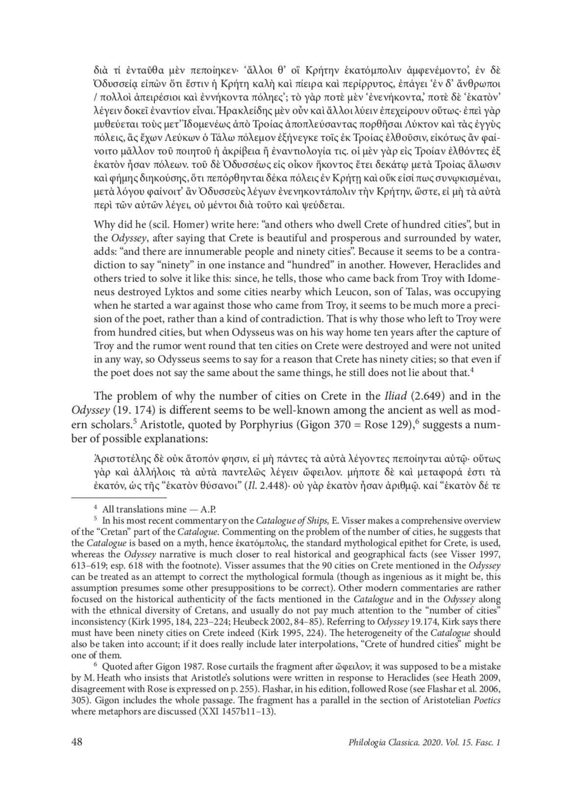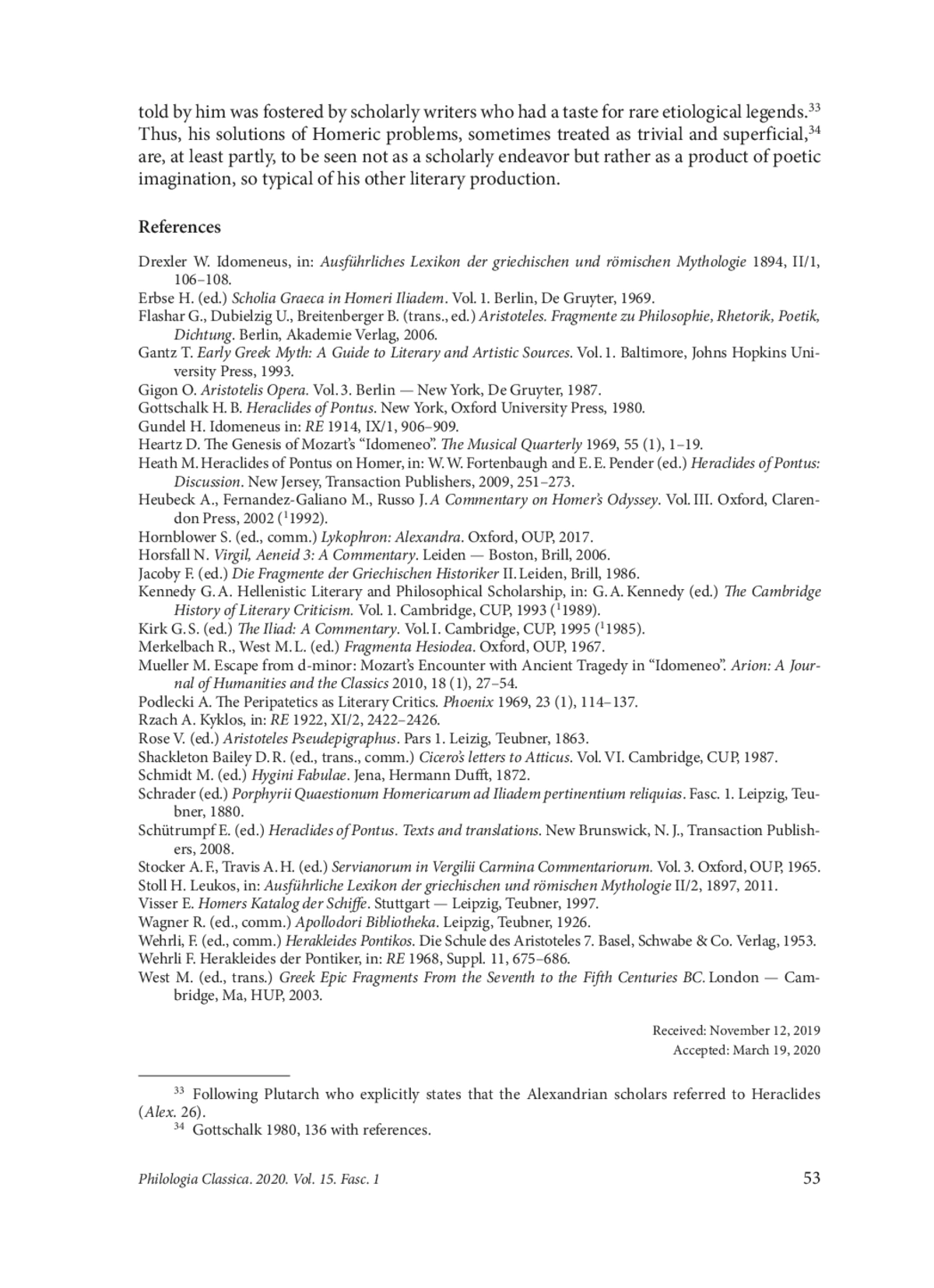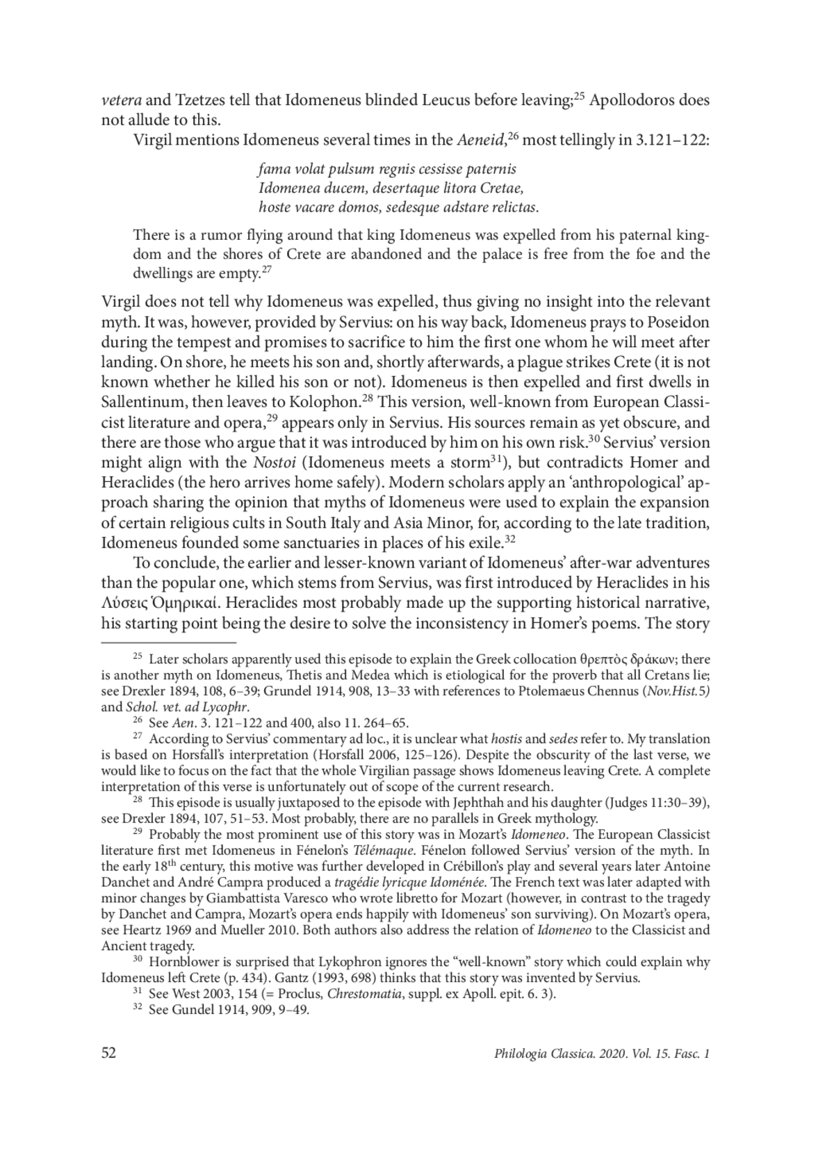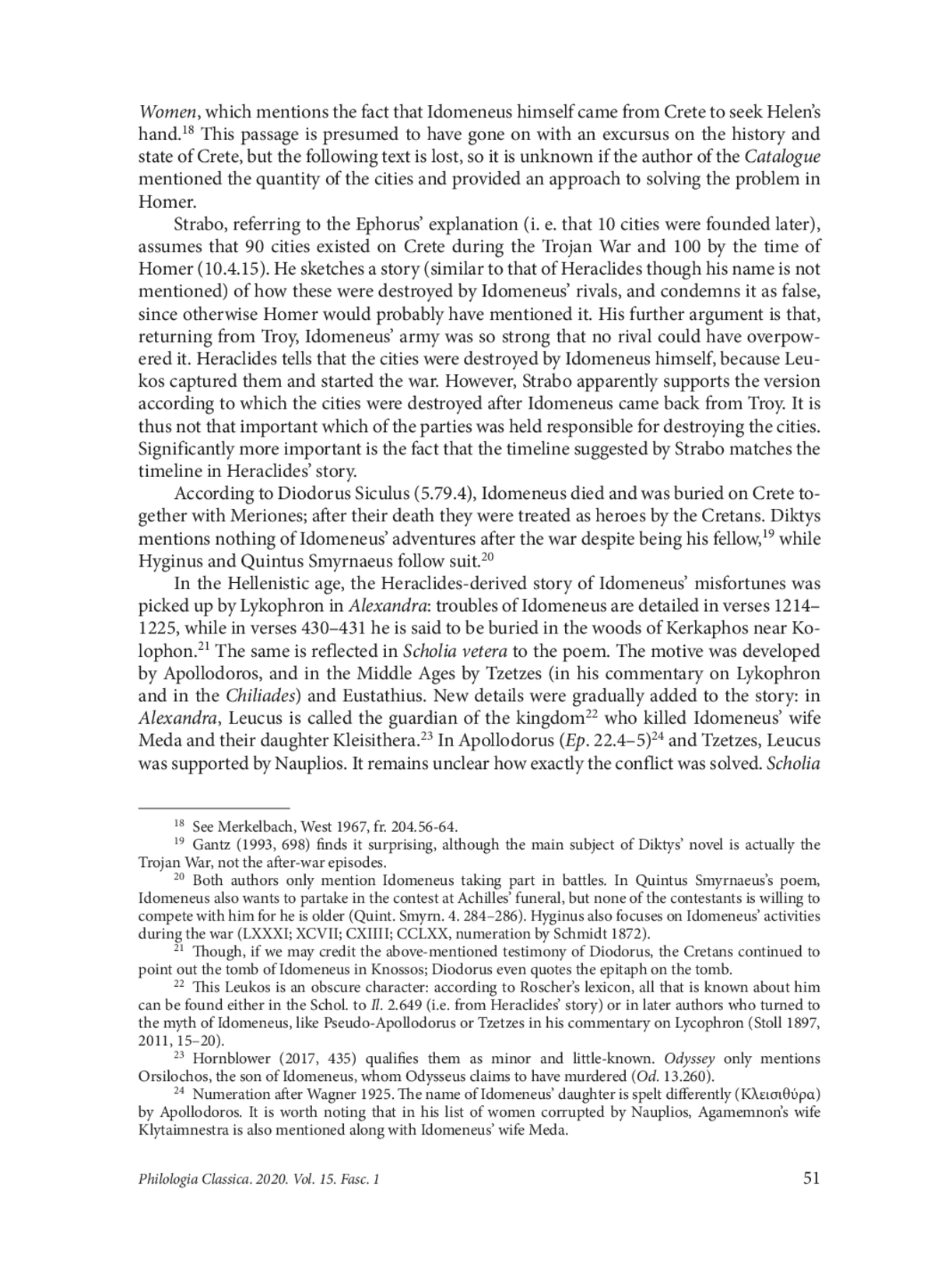 Heraclides of Pontus, a versatile philosopher whose work still remains largely unexplored, wrote several pieces on Homer including “Solutions of the Homeric problems”, to which some of the extant fragments are attributed. One of these (F. 171 Wehrli = 99 Schütrumpf) concerns the Iliad and the Odyssey being discrepant in the number of the cities on Crete: the Catalogue of Ships refers to the island as ἑκατόμπολιν (Il. 2.649) while Odysseus in his ‘Cretan Lies’ states that people dwell ninety great cities on Crete (Od. 19.174). To explain this inconsistency, Heraclides tells a dramatic story about Idomeneus which he probably made up himself, being an eminent author of dialogues and even tragedies (provided that the relevant testimonies are reliable) with an interest in mythology. His version of Idomeneus’ homecoming was not supported by contemporary historians, and, although later picked up by some poets and scholars, did not end up as a part of the commonplace Idomeneus tradition as we know it today