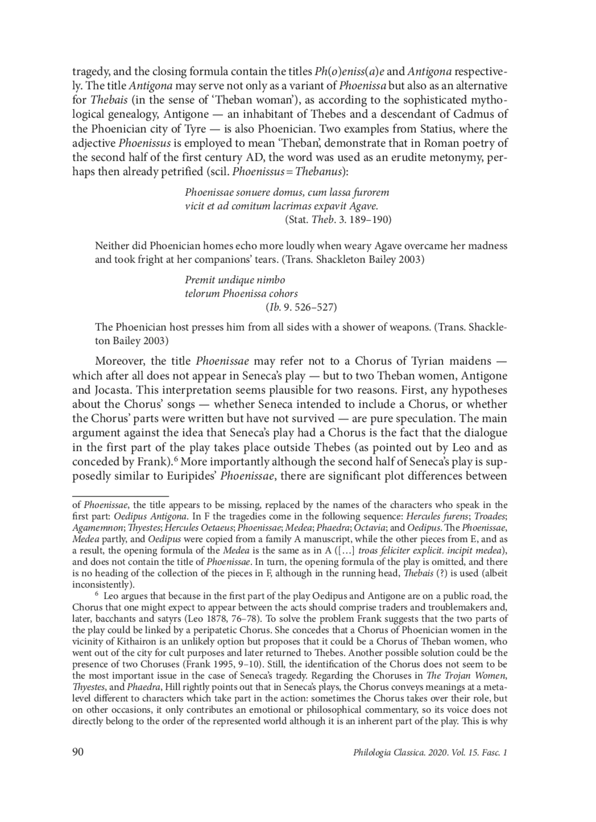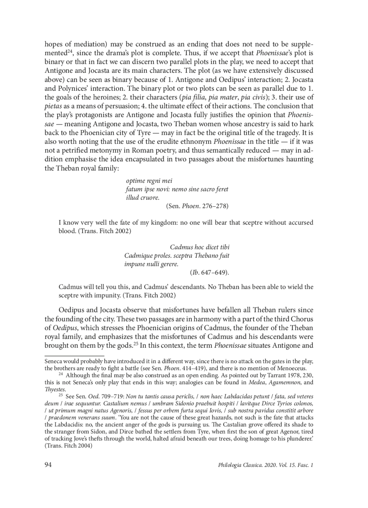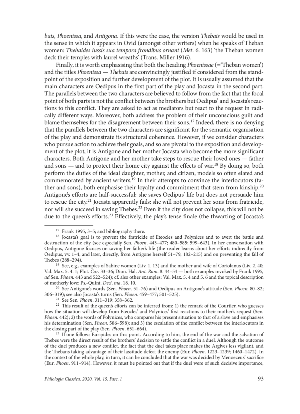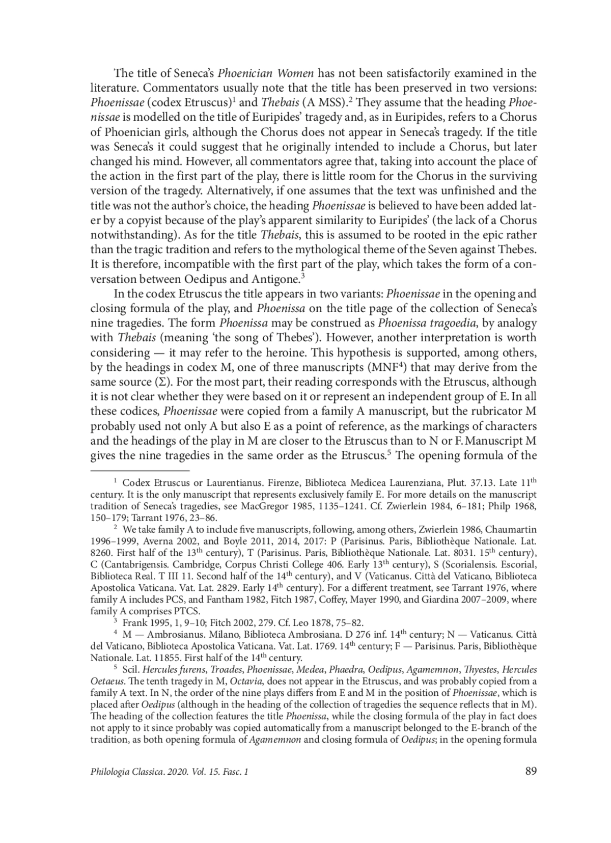 This paper aims to revise the status quaestionis of the title of a play by Seneca preserved in two commonly recognised variants — Phoenissae and Thebais — and two less well-known variants — Phoenissa and Antigona. It has been generally accepted that only the title Phoenissae is correct, and that this title was modelled on Euripides’ drama of the name. This view, however, can hardly be deemed plausible, considering the substantial differences between Seneca’s and Euripides’ Phoenissae. Moreover, it has been widely held that there is no analogy for the title Thebais in the dramatic tradition but that it has equivalents in epic texts, which has led to the conclusion that Thebais is an ill-chosen interpolation. The other variants of the title have not been discussed at all. In this article we scrutinise previously disregarded sources and argue that all the play’s titles may have originated in Classical Antiquity and may be regarded as synonyms. We also demonstrate that the interpretation of the title Phoenissae as referring to a Chorus of Tyrian maidens is purely speculative, since the links between Seneca’s and Euripides’ Phoenissae cannot be unequivocally defined. We posit that the Romans may have understood both the title of Euripides’ play and of its probable imitation written by Accius as alluding to the heroines, Jocasta and Antigone. The examples found in Statius’ verse may be used as evidence that the adjective Phoenissus was understood by the educated Roman public as Thebanus. In the final part of the paper, we analyse the dramatic action of Phoenissae, which leads us to the conclusion that the interpretation of the title as a metonymic term describing Jocasta and Antigone is accurate