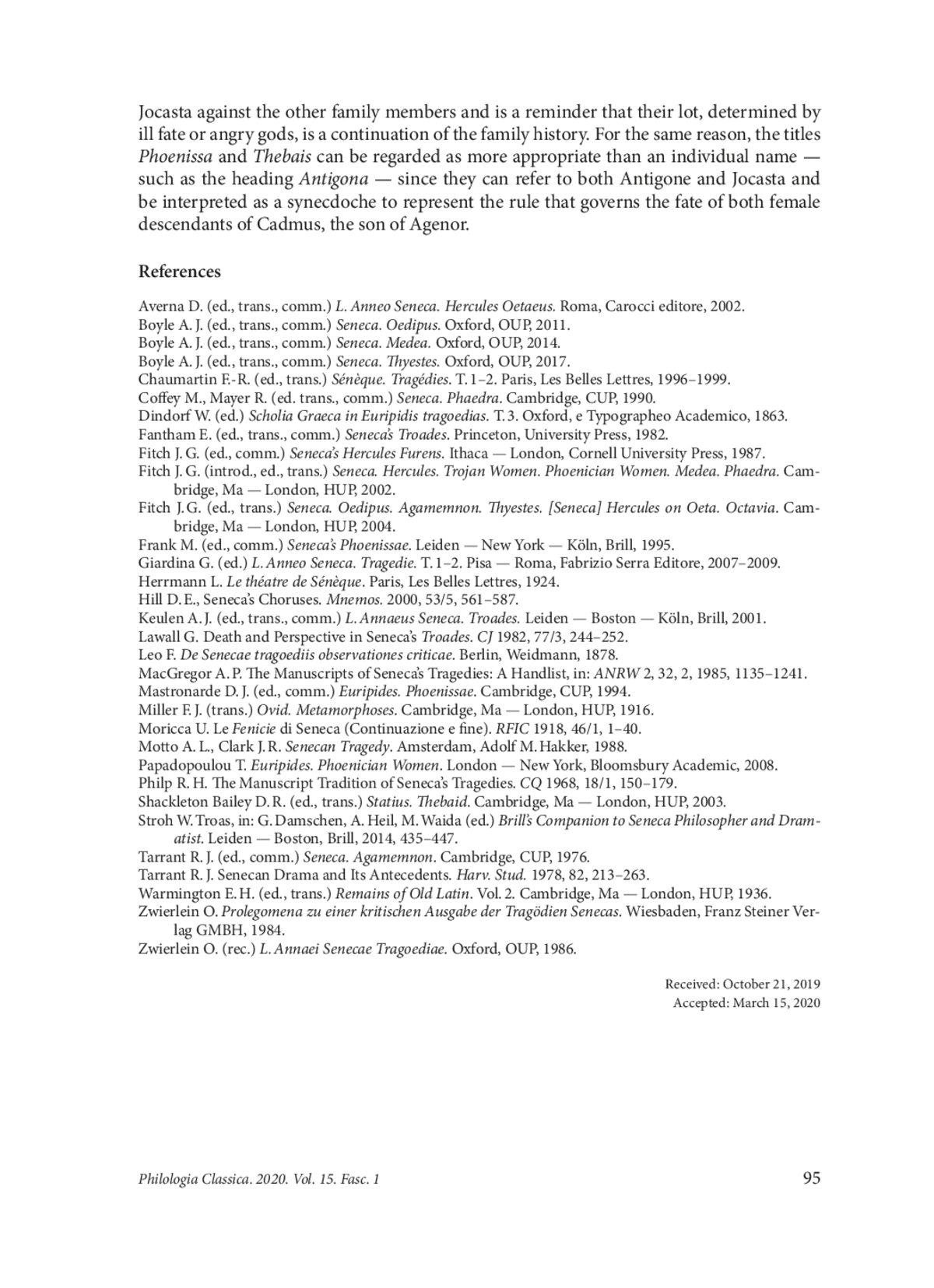 1. Averna D. (ed., trans., comm.) L. Anneo Seneca. Hercules Oetaeus. Roma, Carocci editore, 2002.