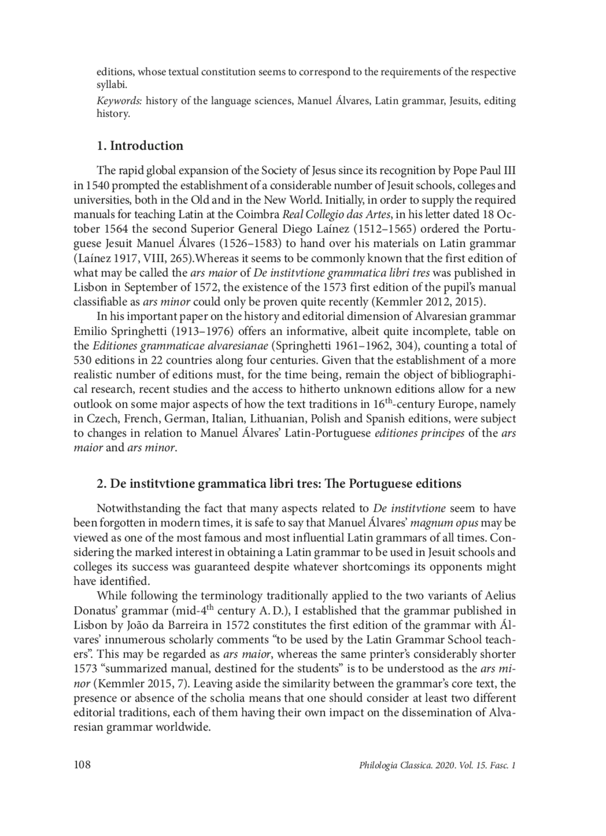 The rapid global expansion of the Society of Jesus since its recognition by Pope Paul III in 1540 prompted the establishment of a considerable number of Jesuit schools, colleges and universities, both in the Old and in the New World. Initially, in order to supply the required manuals for teaching Latin at the Coimbra Real Collegio das Artes, in his letter dated 18 October 1564 the second Superior General Diego Laínez (1512–1565) ordered the Portuguese Jesuit Manuel Álvares (1526–1583) to hand over his materials on Latin grammar (Laínez 1917, VIII, 265). Whereas it seems to be commonly known that the first edition of what may be called the ars maior of De institvtione grammatica libri tres was published in Lisbon in September of 1572, the existence of the 1573 first edition of the pupil’s manual classifiable as ars minor could only be proven quite recently (Kemmler 2012, 2015)