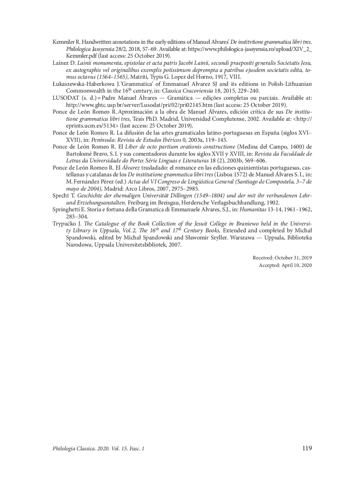 40. Kemmler R. Handwritten annotations in the early editions of Manuel Alvares’ De institvtione grammatica libri tres. Philologica Jassyensia 28/2, 2018, 57-69. Available at: https://www.philologica-jassyensia.ro/upload/XIV_2_Kemmler.pdf (last access: 25 October 2019).