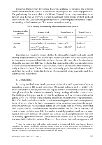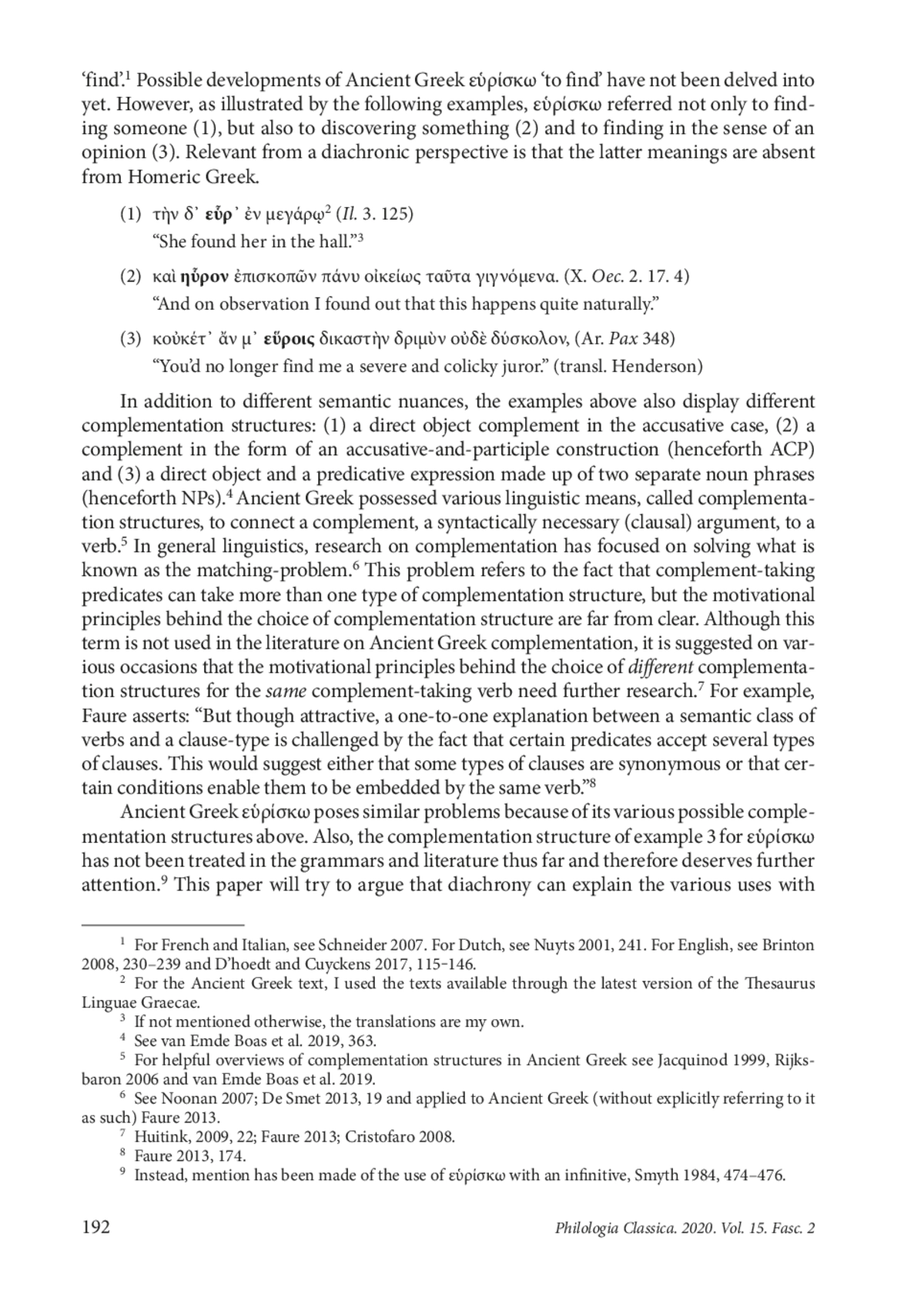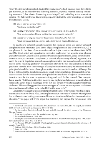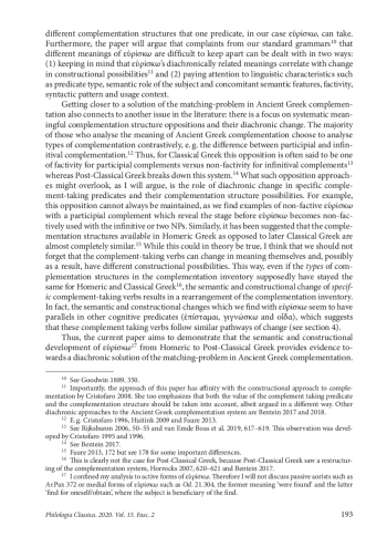 This paper traces the semantic and constructional development of the complement-taking verb εὑρίσκω ‘find’ from Homeric Greek to Post-Classical Greek. First, the paper details the semantic development of εὑρίσκω using characteristics such as predicate type, semantic role of the subject and factivity. Subsequently, explanations are offered for the constructional development of εὑρίσκω, using insights from grammaticalization research such as reanalysis and analogy. In contrast to previous studies on Ancient Greek complementation which support the idea of a systematic Classical Greek opposition of factive participial versus non-factive infinitival complementation, this paper shows how bridging contexts of mental judgment εὑρίσκω with a participial complement do not follow this opposition as they are non-factive and changed their meaning (with reanalysis) before changing their complementation structure (through analogy). Also, by extending our view to the individual history of other cognitive predicates (ἐπίσταμαι, γιγνώσκω and οἶδα) the author shows that other cognitive predicates undergo similar developments from factive+object to factive+ACP to non-factive+ACI, although their individual histories are still in need of a systematic diachronic account. Thus, complementation patterns per period could be analysed in a more fine-grained way by analysing complementation patterns bottom-up from the semantic and constructional evolutions of individual predicates. Also, the findings from this paper provide evidence towards a diachronic solution of the so-called matching-problem: diachronically related semantic and constructional stages strongly motivate the choice of a specific complementation structure but absolute factivity oppositions in Classical Greek complementation are rather strong tendencies