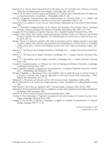 5. Bentein K. Finite vs. non-finite complementation in Post-classical and Early Byzantine Greek. Towards a pragmatic restructuring of the complementation system? Journal of Greek Linguistics 2017, 17, 3-36.