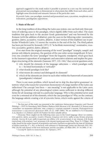 The article attempts, firstly, to critically analyze the traditional order of cases in Latin, secondly, to discover an internal mechanism that brings the elements of a paradigm together, and thirdly, to present a new model of the nominal and pronominal case paradigms in Latin. The authors develop the idea that the crucial role in structuring a case paradigm belongs to morphemic syncretism. The syncretism is treated as a systemic phenomenon of morpheme neutralization rather than a result of phonetic reduction. In the paradigm built on this principle, the cases marked with the same endings necessarily take adjacent positions. There is a certain correlation between the morphemic syncretism and the semantics of cases extensively exemplified in the Latin literature. Taking this as reference point, the authors establish a formally motivated paradigmatic order of cases and single out a set of semantic features that shape the case paradigm. This method enables authors to find the non-contradictory paradigmatic positions for both the core and the “marginal” cases (vocative and locative). Applied to the pronominal cases, however, it reveals the significant discrepancy between the nominal and pronominal paradigms concerning two cases — nominative and genitive. The pronominal nominative’s special status is determined by its pragmatic rather than syntactic functions, which is typical for pro-drop languages. The genitive case appears in three different forms that originate from the possessive pronouns and correspond to the three basic functions of the genitive — possessive, objective, and partitive ones. Such transparadigmatic syncretism brings together the paradigms of personal and possessive pronouns, which are related by nature. The ORBIS ROMANUS approach suggested in this study makes it possible to present in a new way the nominal and pronominal case paradigms, to demonstrate in what points they differ from each other, and to highlight some functional and semantic features of the particular cases