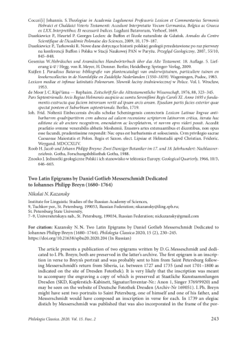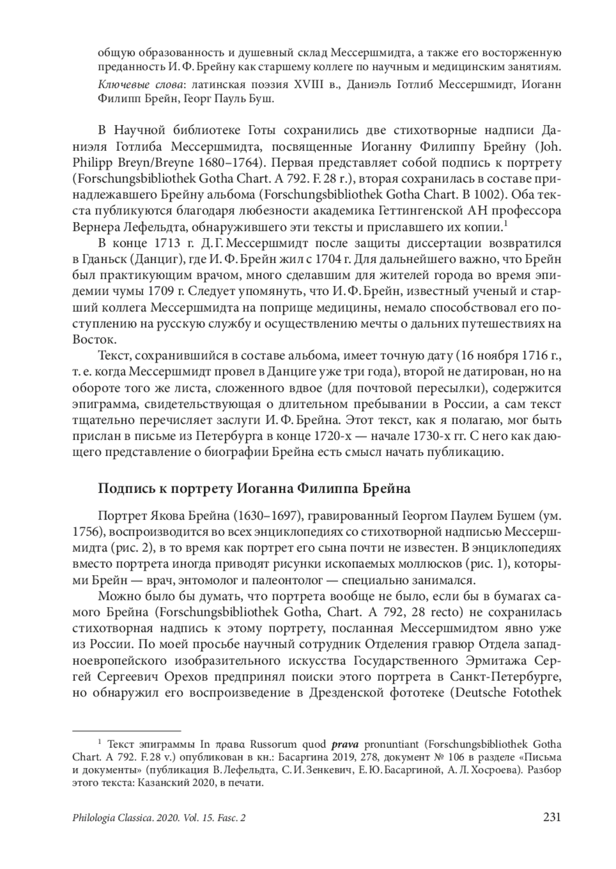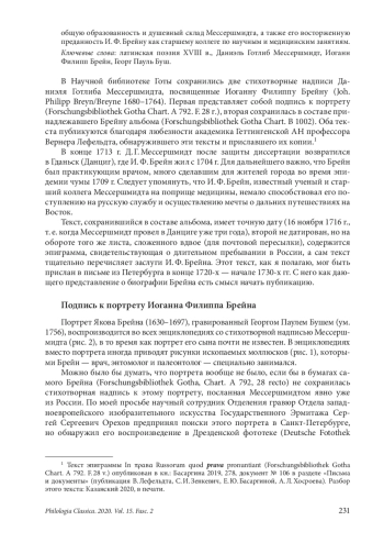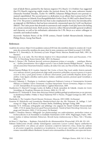 В статье публикуются две эпиграммы Д. Г. Мессершмидта, посвященные И. Ф. Брейну и сохранившиеся среди его бумаг. Первая представляет собой стихотворную подпись к портрету самого Брейна и была, скорее всего, отправлена из Петербурга уже после возвращения Мессершмидта из Сибири, то есть между 1727 и 1735 гг. (а не в 1701– 1800, как указано на сайте Дрезденского фотоархива). Правдоподобно, что подпись предназначалась для гравюры, один из экземпляров которой хранится в Staatliche Kunstsammlungen Dresden и представлен на сайте Deutsche Fotothek Dresden. Не исключено, что Иоганн Филипп Брейн послал в Петербург и портрет отца, и свой собственный (оба работы неизвестного мастера), и что к обоим Мессершмидт сделал стихотворные подписи. В 1739 г. был опубликован элегический дистих Мессершмидта, включенный в обрамление портрета Якоба Брейна работы знаменитого гравера П. Г. Буша. Как предположил С. С. Орехов, гравюра Г. П. Буша восходит к работе того же неизвестного мастера. Портрет Иоганна Филиппа не был опубликован, возможно потому, что поместить такой текст под своим портретом И. Ф. Брейн не мог. Второе стихотворение представляет собой запись в альбом, хранившийся в Музее И. Ф. Брейна в Гданьске, и датировано ноябрем 1716 г. Это стихотворение не имеет заголовка (что подчеркнуто в самом тексте), но предваряется древнееврейским эпиграфом, подробный комментарий к которому сделал К. А. Битнер. Латинское стихотворение, изобилующее звуковыми повторами и усложненное языковой игрой, оставляет ощущение некоторого нравственного надлома. Оба стихотворения характеризуют общую образованность и душевный склад Мессершмидта, а также его восторженную преданность И. Ф. Брейну как старшему коллеге по научным и медицинским занятиям