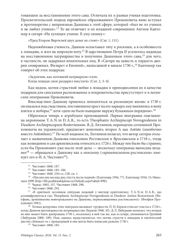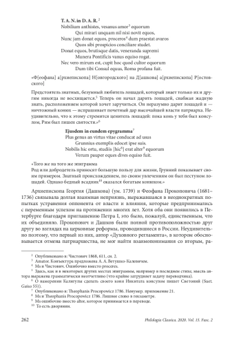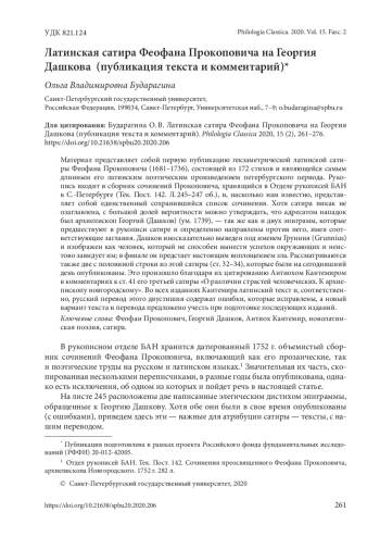 Материал представляет собой первую публикацию гекзаметрической латинской сатиры Феофана Прокоповича (1681–1736), состоящей из 172 стихов и являющейся самым длинным его латинским поэтическим произведением петербургского периода. Рукопись входит в сборник сочинений Прокоповича, хранящийся в Отделе рукописей БАН в С.-Петербурге (Тек. Пост. 142. Л.245–247 об.), и, насколько нам известно, представляет собой единственный сохранившийся список сочинения. Хотя сатира никак не озаглавлена, с большой долей вероятности можно утверждать, что адресатом нападок был архиепископ Георгий (Дашков) (ум. 1739), — так же как и двух эпиграмм, которые предшествуют в рукописи сатире и определенно направлены против него, имея соответствующие заглавия. Дашков иносказательно выведен под именем Грунния (Grunnius) и изображен как человек, который не способен вынести успехов окружающих и неистово завидует им; в финале он предстает настоящим воплощением зла. Рассматриваются также две с половиной строки из этой сатиры (ст. 32–34), которые были на сегодняшний день опубликованы. Это произошло благодаря их цитированию Антиохом Кантемиром в комментариях к ст. 41 его третьей сатиры «О различии страстей человеческих. К архиепископу новгородскому». Во всех изданиях Кантемира латинский текст и, соответственно, русский перевод этого двустишия содержат ошибки, которые исправлены, а новый вариант текста и перевода предложено учесть при подготовке последующих изданий
