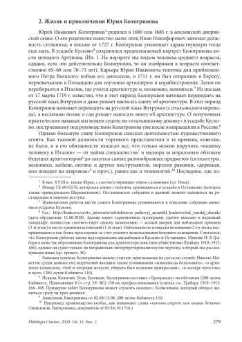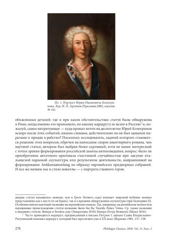 История приобретения Юрием Кологривовым статуи, которая традиционно носит название по Таврическому дворцу,1 включает множество белых пятен и не объяснимых деталей: где и при каких обстоятельствах статуя была обнаружена в Риме, когда именно это произошло, по какому маршруту ее везли в Россию2 и, пожалуй, самое интригующее — куда пропал почти на десятилетие Юрий Кологривов вскоре после этих событий, иными словами, действительно ли он был захвачен пиратами и продан в рабство? Поскольку исследователь, задачей которого становится решение этих вопросов, обречен на написание скорее авантюрного романа, чем научной статьи, автором был выбран более скромный, хотя не менее интересный с точки зрения формирования российской школы антиковедения, вопрос: было ли приобретение античного оригинала счастливой случайностью при закупке итальянской парковой скульптуры или результатом деятельности, направленной на формирование Antikensammlung по образцу европейских придворных собраний. И все же начнем мы в стиле новеллы — с портрета главного героя