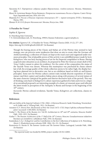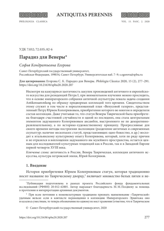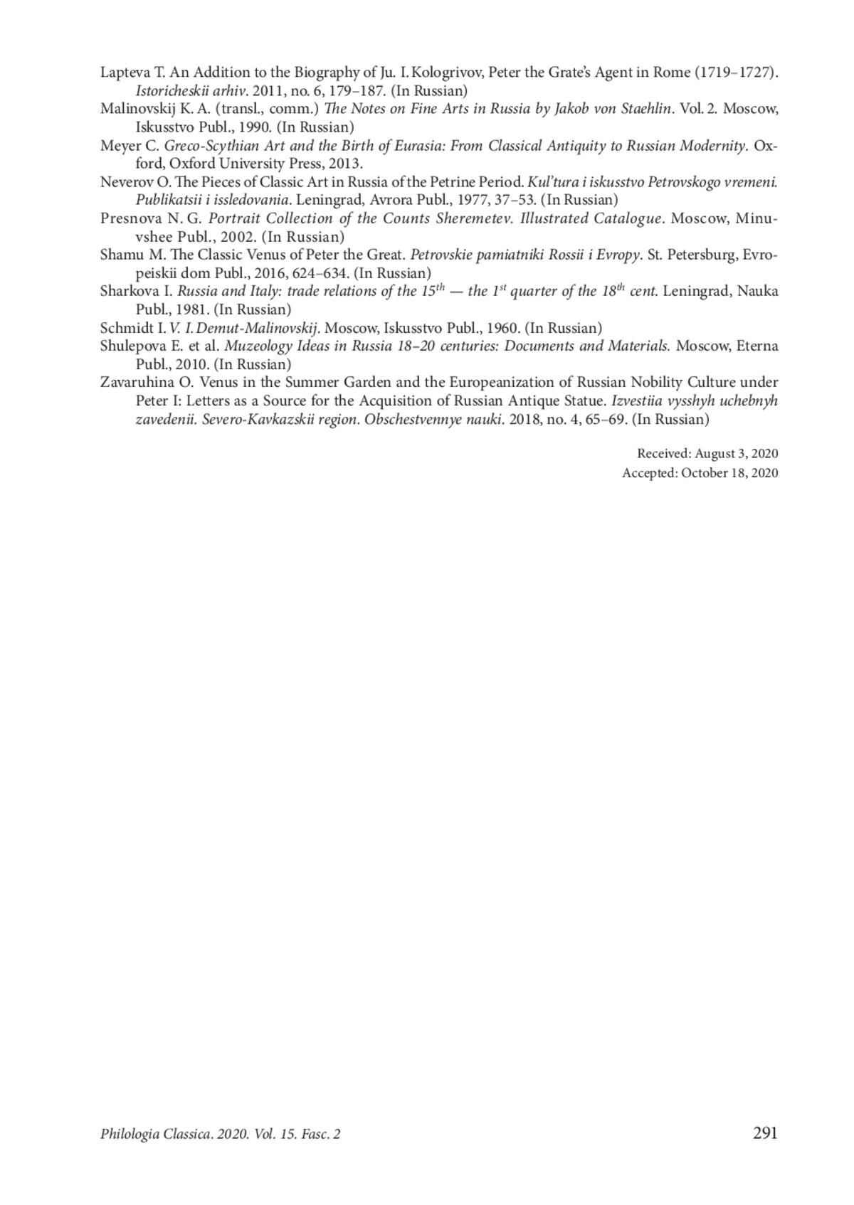 5. Заварухина О. А. Венера в Летнем саду и европеизация культуры русского дворянства при Петре I: письма как источник по приобретению Россией античной статуи. Известия высших учебных заведений. Север-Кавказский регион. Общественные науки. 2018, 4, 65-69.