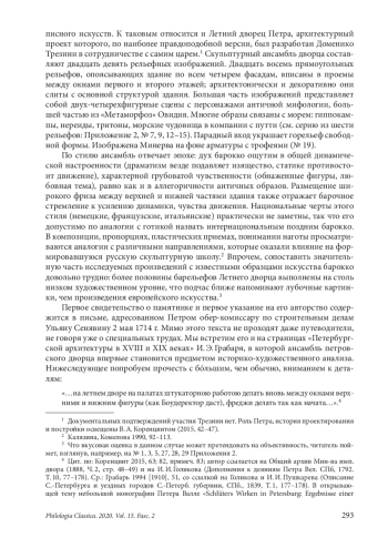 Авторство двадцати девяти рельефов, составляющих скульптурный ансамбль Летнего дворца Петра I, дискутируется в науке с начала XX в. Попытки приписать их Андреасу Шлютеру († май/июнь 1714), равно как и другим архитекторам и скульпторам, продолжавшим начатые Шлютером в России постройки (Браунштейну, Маттарнови, Леблону, Микетти), оказываются в той или иной степени уязвимыми. Между тем аллегорическая программа комплекса, общая композиция, размещение рельефов по фасадам определяются единым творческим замыслом, настолько же смелым, насколько и своеобразным. Мало сомнений в том, что автором этого трудноисполнимого замысла был сам Петр I, воплощать же его приходилось разным, в том числе местным, мастерам. О роли Петра свидетельствует и трактовка мифологических сюжетов, взятых из «Метаморфоз» Овидия (часть из них опознана ошибочно, другие не получили адекватного истолкования в аллегорическом ключе). На причастность царя к созданию рельефов указывает один из возможных источников их образности. Ренатой Кроль установлено, что для пяти рельефов таким источником были гравюры Дж. А. Мальоли, копированные А. Фуксом (их сюжеты также соотносимы с Овидием). Другим могли быть иллюстрации к «Метаморфозам» Ш. Лебрена, известные Петру по копии И. Крауса