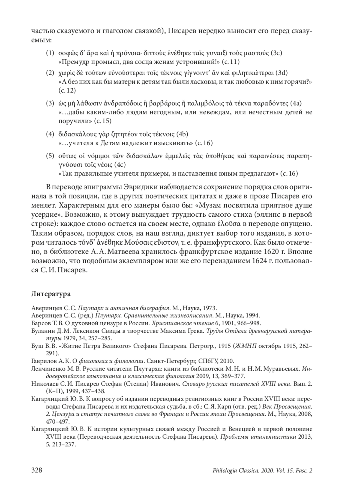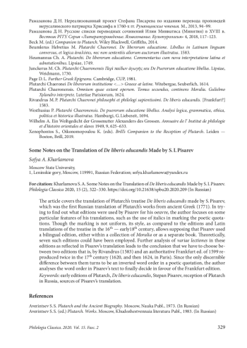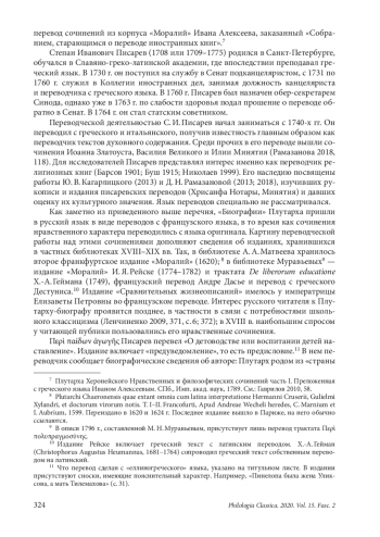 Опубликованный С. И. Писаревым в 1771 г. перевод трактата ПлутархаDe liberis educandis (Περὶ παίδων ἀγωγῆς) неожиданно оказывается первым русским переводом Плутарха с языка оригинала («еллиногреческого»). Статья посвящена некоторым особенностям этого перевода, а главным образом, — выявлению его источника, то есть того базового издания, которым пользовался Писарев в своей переводческой работе (контаминация, конечно, не исключается). При этом поиске автор прежде всего уделяет внимание маркированию поэтических цитат. Встроенные в текст трактата цитаты в переводе Писарева выделены курсивом, частью — вместе с последующим авторским текстом Плутарха, который, очевидно, воспринимается переводчиком как продолжение цитаты. В латинских переводах, которые сопровождают греческий текст в доступных Писареву двуязычных греко-латинских изданиях цитаты даются с отступом и выделяются курсивом. Переводчик мог пользоваться одним из таких изданий. С другой стороны, указанного критерия недостаточно, поскольку единообразие оформления цитат отсутствует в изданиях трактата отдельными книгами. Поэтому для более уверенного опознания источника автор сравнивает текст перевода с греческим текстом нескольких изданий XVI–XVIII вв. Анализ разночтений последовательно исключает все издания, кроме двух, выбор между которыми затрудняется тем обстоятельством, что отличие между ними сводится к порядку слов в цитате. Тем не менее анализ порядка слов в переводах поэтических цитат у Писарева позволяет предположить, что его источником послужило франкфуртское издание 1599 г., переизданное в 1620 г. и затем в Париже в 1624 г