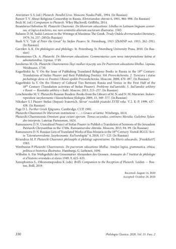 7. Ленчиненко М. В. Русские читатели Плутарха: книги из библиотеки М. Н. и Н. М. Муравьевых. Индоевропейское языкознание и классическая филология 2009, 13, 369-377. EDN: SZWXGF