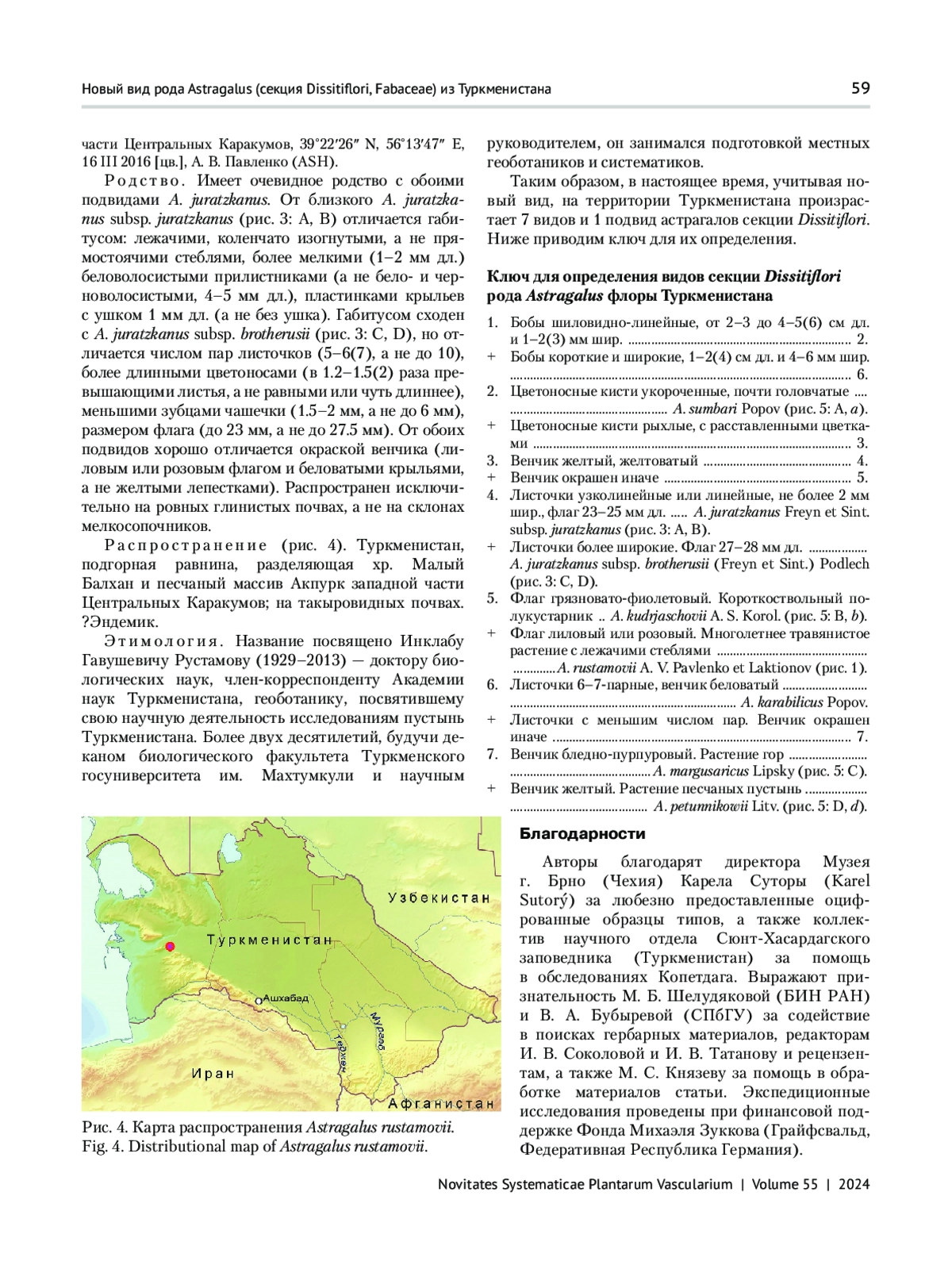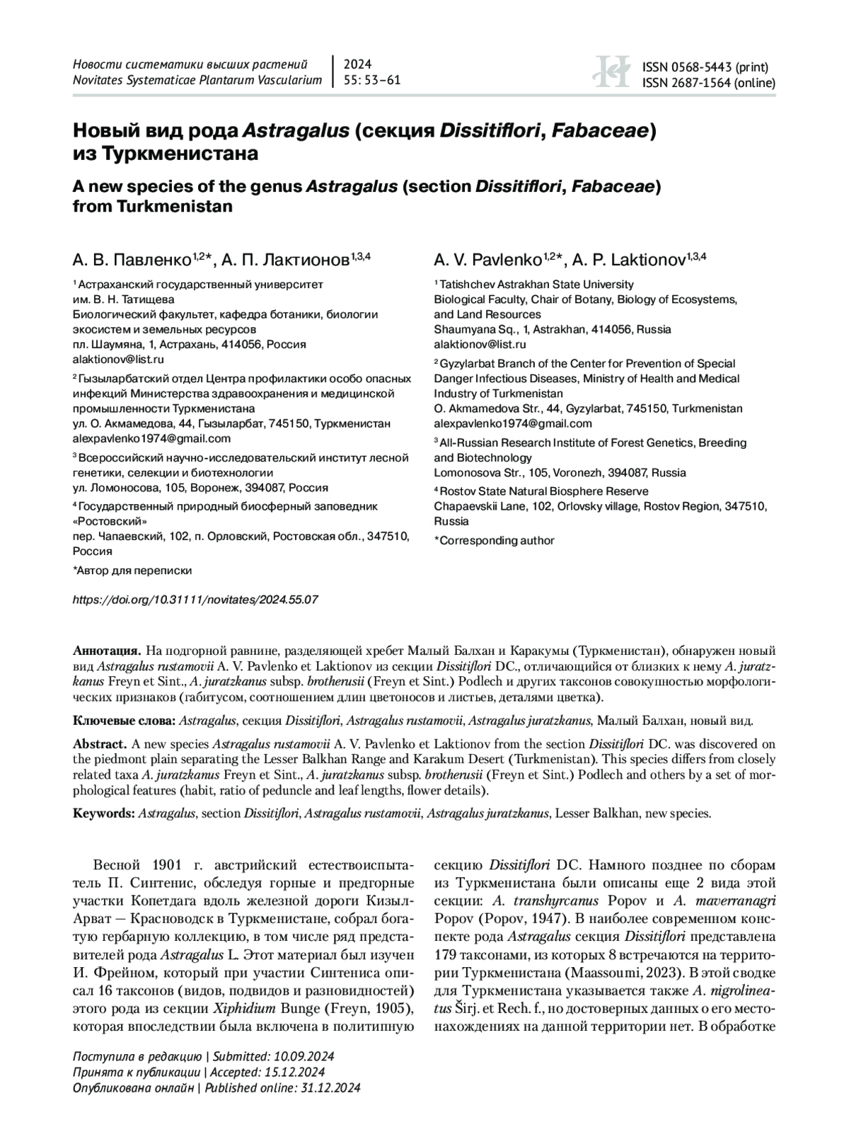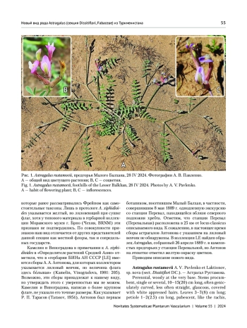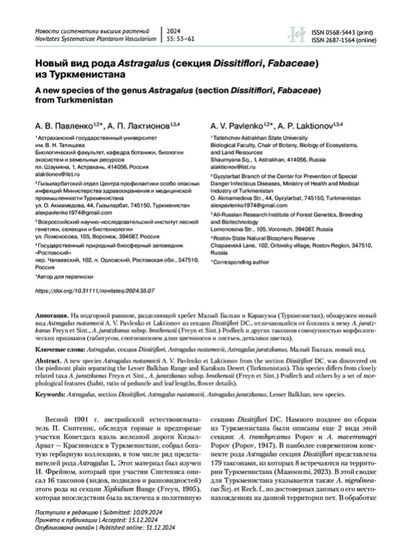 На подгорной равнине, разделяющей хребет Малый Балхан и Каракумы (Туркменистан), обнаружен новый вид Astragalus rustamovii A. V. Pavlenko et Laktionov из секции Dissitiflori DC., отличающийся от близких к нему A. juratzkanus Freyn et Sint., A. juratzkanus subsp. brotherusii (Freyn et Sint.) Podlech и других таксонов совокупностью морфологических признаков (габитусом, соотношением длин цветоносов и листьев, деталями цветка).