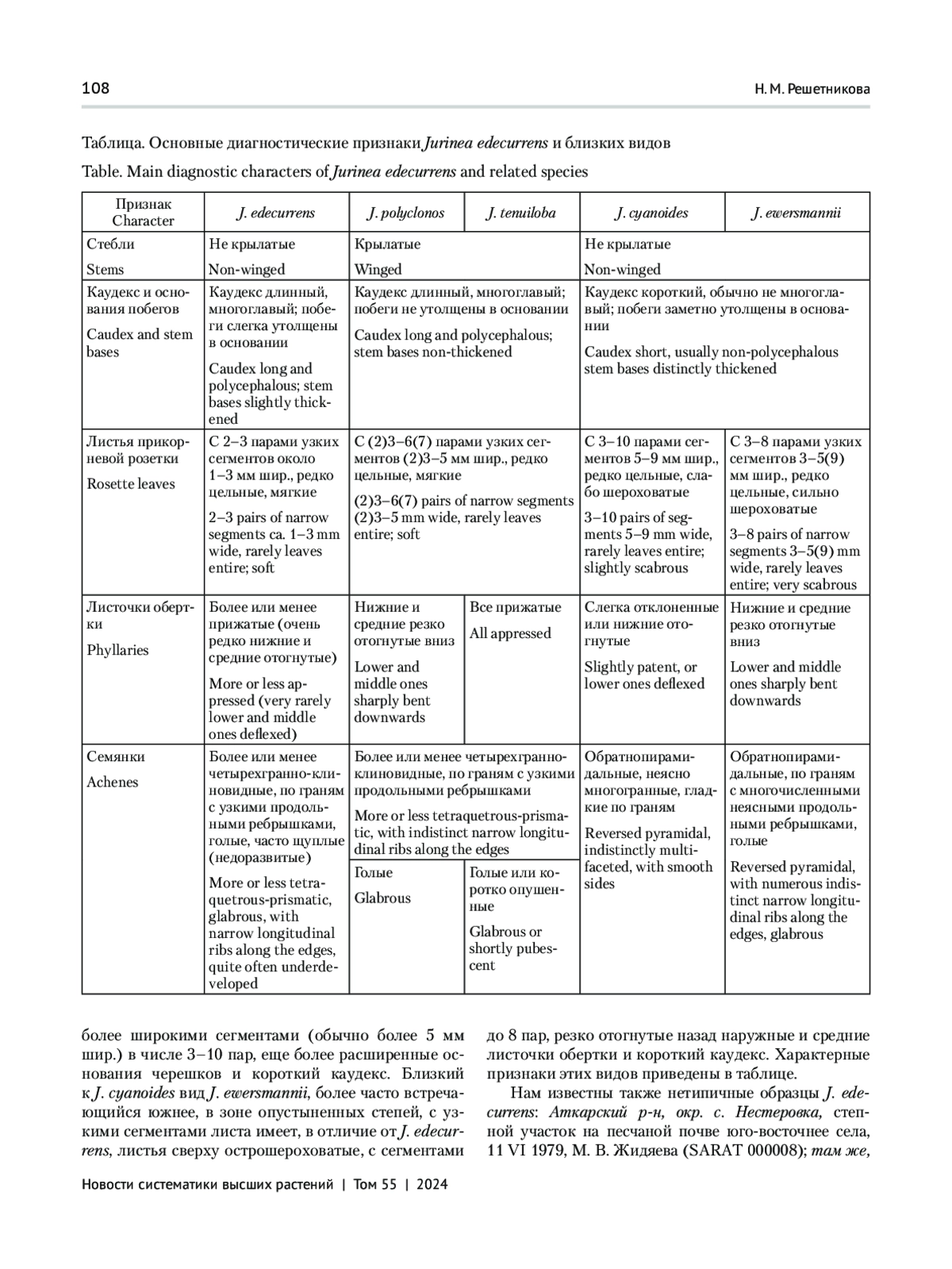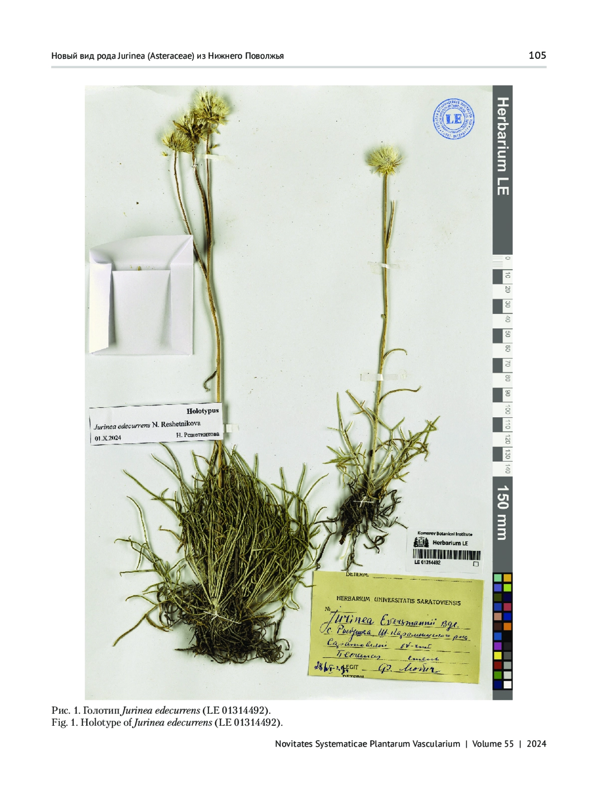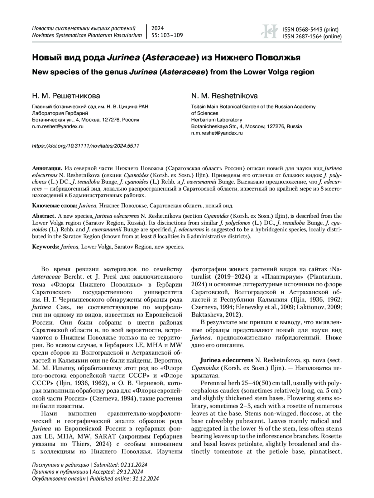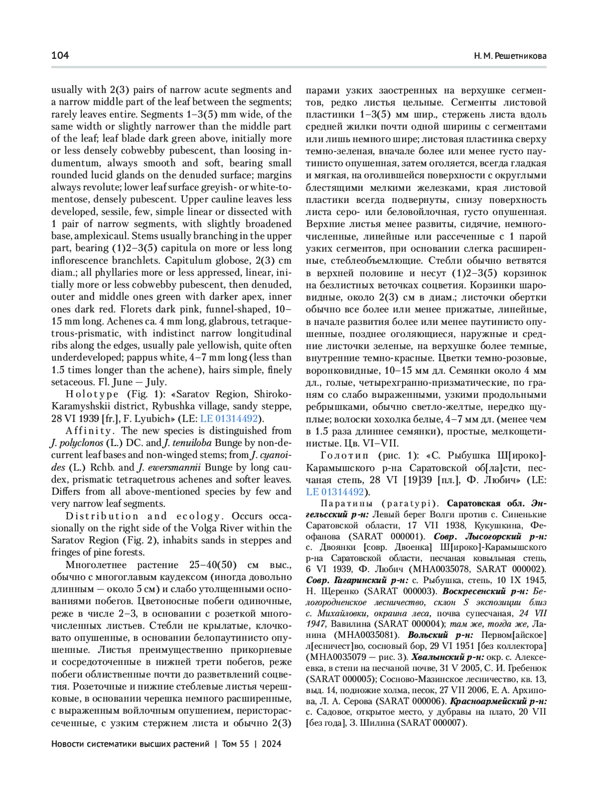 Во время ревизии материалов по семейству Asteraceae Bercht. et J. Presl для заключительного тома «Флоры Нижнего Поволжья» в Гербарии Саратовского государственного университета им. Н. Г. Чернышевского обнаружены образцы рода Jurinea Cass., не соответствующие по морфологии ни одному из видов, известных из Европейской России. Они были собраны в шести районах Саратовской области и, по всей вероятности, встречаются в Нижнем Поволжье только на ее территории. Во всяком случае, в Гербариях LE, MHA и MW среди сборов из Волгоградской и Астраханской областей и Калмыкии они не были найдены. Вероятно, М. М. Ильину, обработавшему этот род во «Флоре юго-востока европейской части СССР» и «Флоре СССР» (Iljin, 1936, 1962), и О. В. Черневой, которая выполнила обработку рода для «Флоры европейской части России» (Czerneva, 1994), такие растения не были известны.