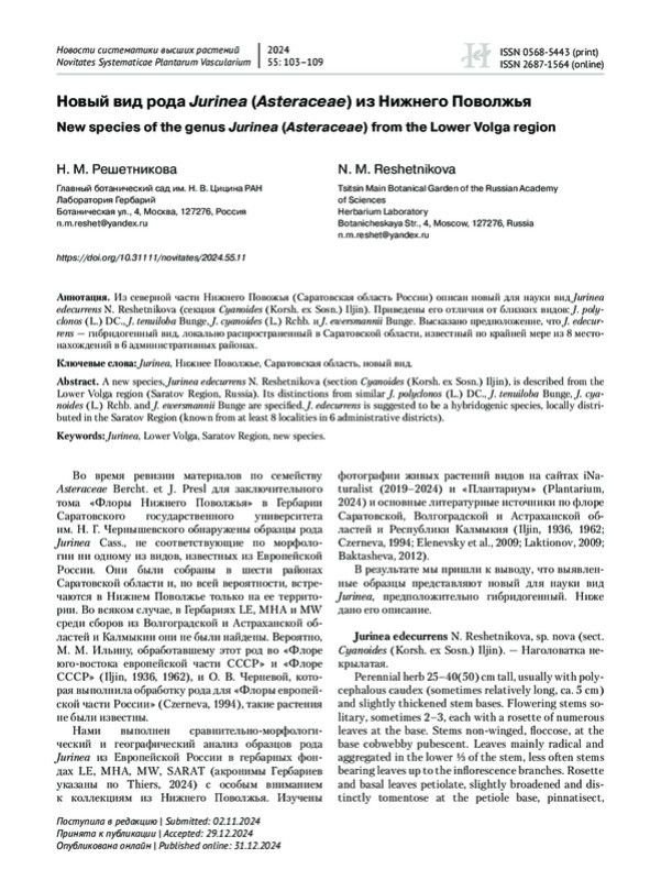 Из северной части Нижнего Повожья (Саратовская область России) описан новый для науки вид Jurinea edecurrens N. Reshetnikova (секция Cyanoides (Korsh. ex Sosn.) Iljin). Приведены его отличия от близких видов: J. polyclonos (L.) DC., J. tenuiloba Bunge, J. cyanoides (L.) Rchb. и J. ewersmannii Bunge. Высказано предположение, что J. edecurrens — гибридогенный вид, локально распространенный в Саратовской области, известный по крайней мере из 8 местонахождений в 6 административных районах.
