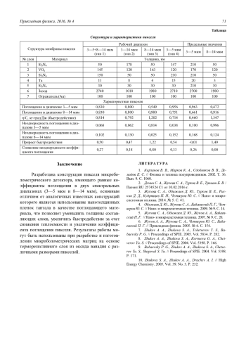 В работе представлены результаты разработки и реализации нового конструктивного варианта пикселя микроболометра, основным отличием от аналогичных известных конструкций которого является использование тонких пленок тантала в качестве поглощающего материала. Использование предлагаемых материалов и толщин слоев, составляющих пиксель, позволяет увеличить и достичь 98 % поглощения ИК-излучения при неоднородности 2,5 % в спектральном диапазоне 8—14 мкм, а также уравнять коэффициенты и достичь равномерности поглощения в спектральном диапазоне 3—5 мкм и 8—14 мкм, повысить быстродействие и чувствительность. Снижение толщины слоев приводит к увеличению температуры пикселя в 3 раза с соответственным увеличением чувствительности болометра, но при сохранении его динамических характеристик.