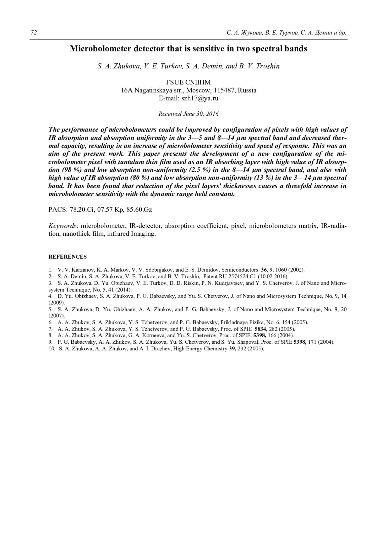 S. A. Zhukova, V. E. Turkov, S. A. Demin, and B. V. Troshin Microbolometer detector that is sensitive in two spectral bands 67
