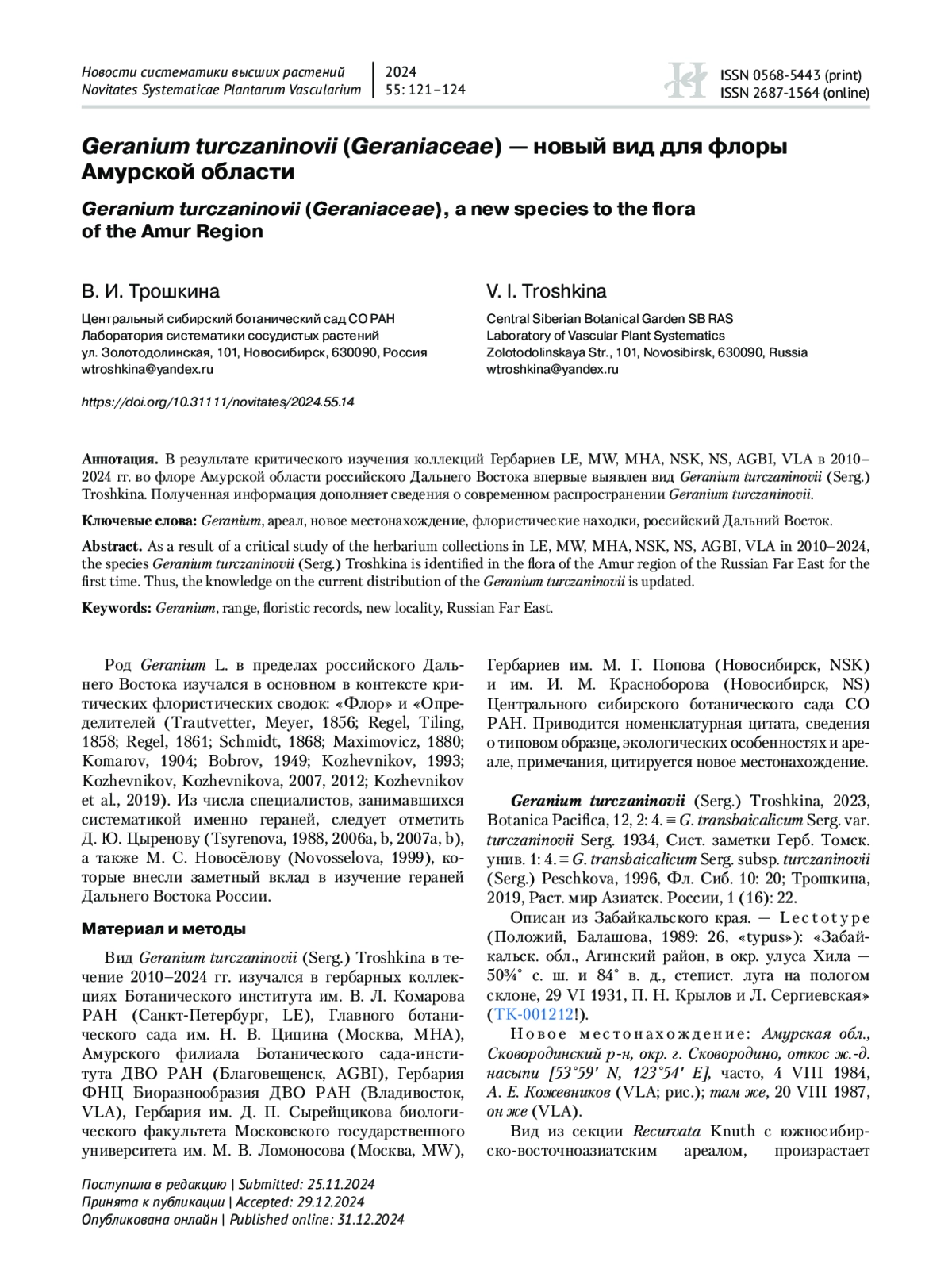 16. Troshkina V. I. 2023. Section Recurvata of the genus Geranium (Geraniaceae): diagnostic sings and distribution features of the taxa in Asian Russia // Rastitel’nyj Mir Aziatskoj Rossii = Flora and Vegetation of Asian Russia. № 4. P 315-325.