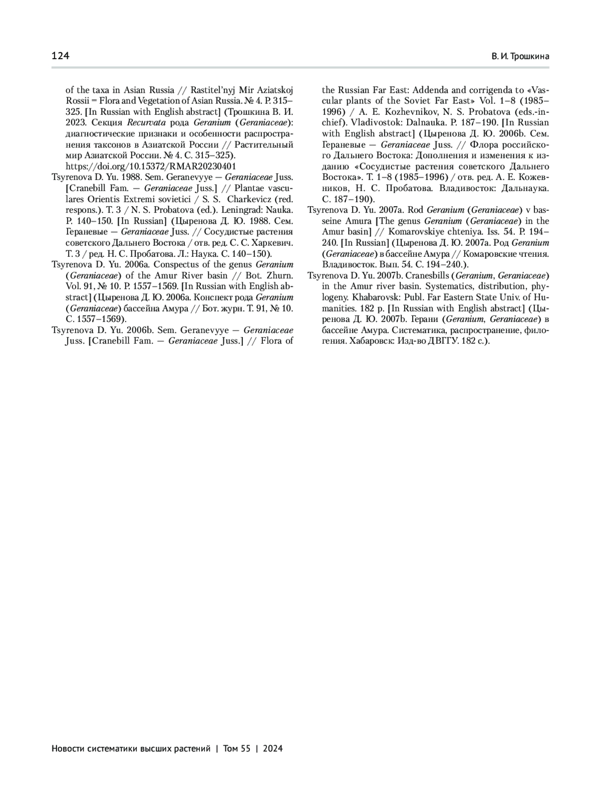 19. Tsyrenova D. Yu. 2007a. Rod Geranium (Geraniaceae) v basseine Amura [The genus Geranium (Geraniaceae) in the Amur basin] // Komarovskiye chteniya. Iss. 54. P. 194240.