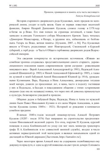 История старинного дворянского рода Кусаковых, моих предков по материнской линии, уходит в глубь веков. Один из первых известных носителей фамилии, боярин Назарий Данилович Кусаков, сложил голову в 1378 году в битве на р. Воже. Его имя попало на страницы летописей, а также было записано в синодик Успенского собора Московского Кремля.