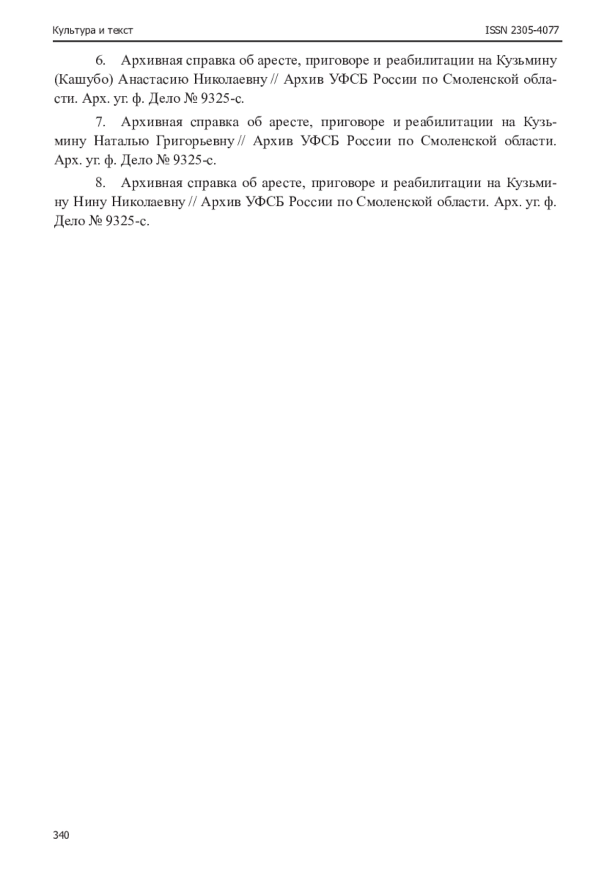 13. Архивная справка об аресте, приговоре и реабилитации на Кузьмину Наталью Григорьевну // Архив УФСБ России по Смоленской области. Арх. уг. ф. Дело № 9325-с.