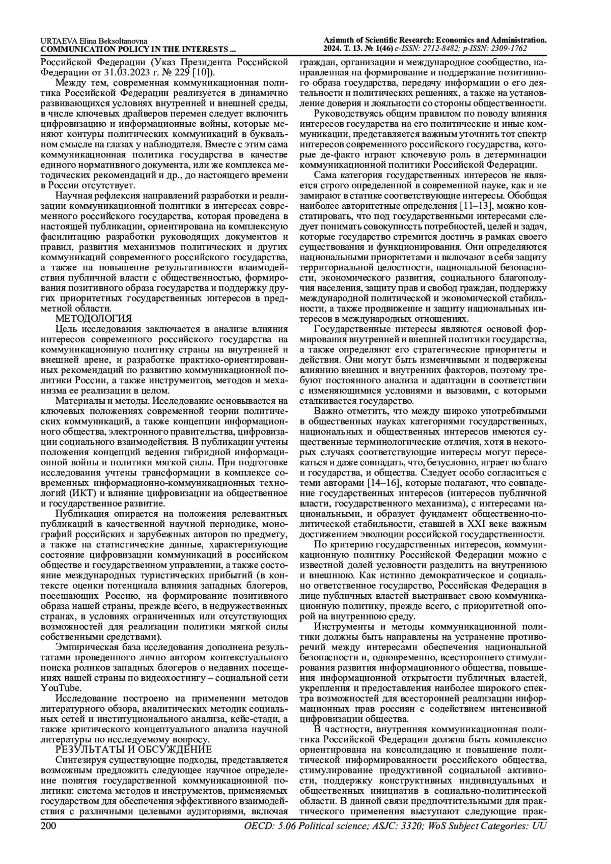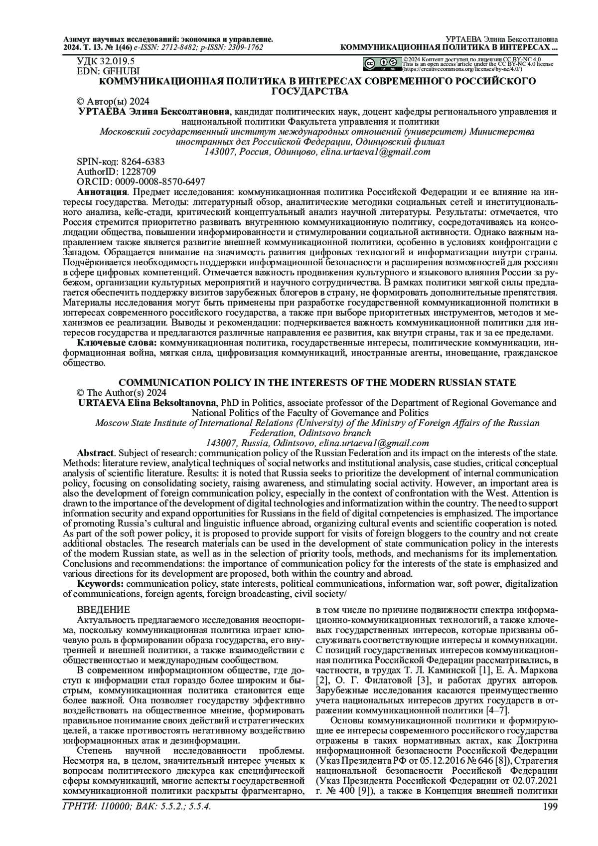 Предмет исследования: коммуникационная политика Российской Федерации и ее влияние на интересы государства.