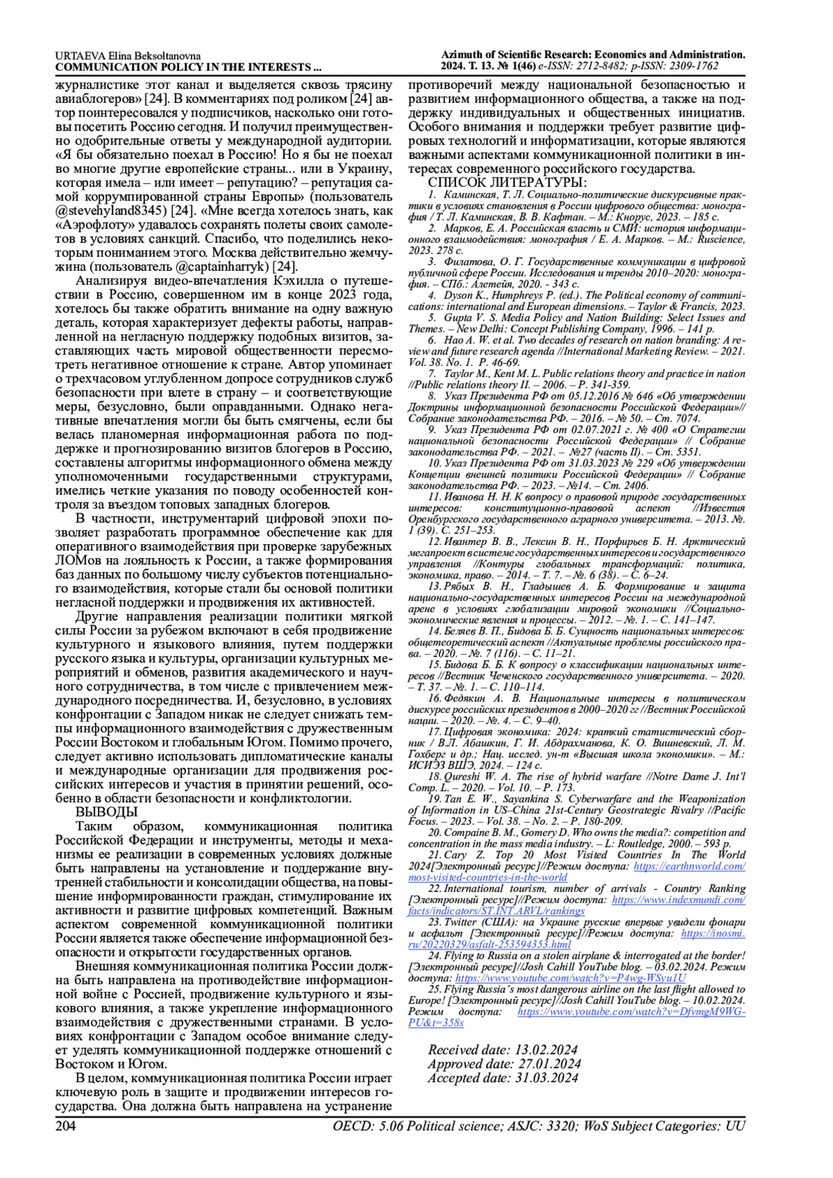 16. Федякин А. В. Национальные интересы в политическом дискурсе российских президентов в 2000-2020 гг //Вестник Российской нации. - 2020. - №. 4. - С. 9-40. EDN: JMTTWP
