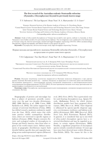 Изучение чешуйчатых золотистых водорослей во Вьетнаме позволило обнаружить в трех пресноводных водоемах Вьетнама редкий вид — эндемик Австралии за пределами его известных ранее местообитаний. Исследования проводились с использованием методов электронной микроскопии и высокопроизводительного секвенирования (метабаркодирование V9-ITS1 rDNA). В статье приведены описание этого вида, оригинальные микрофотографии и особенности его местообитаний.